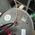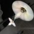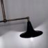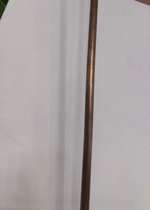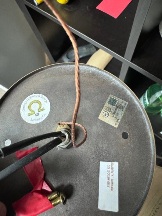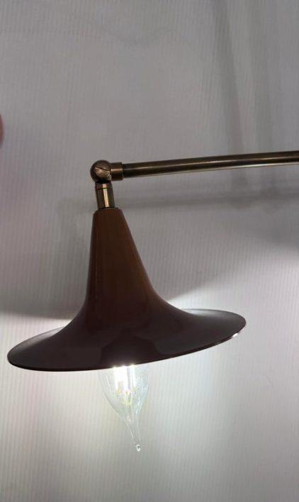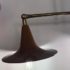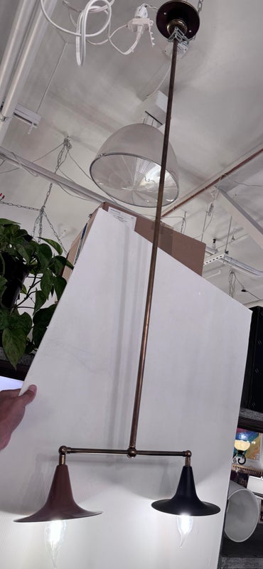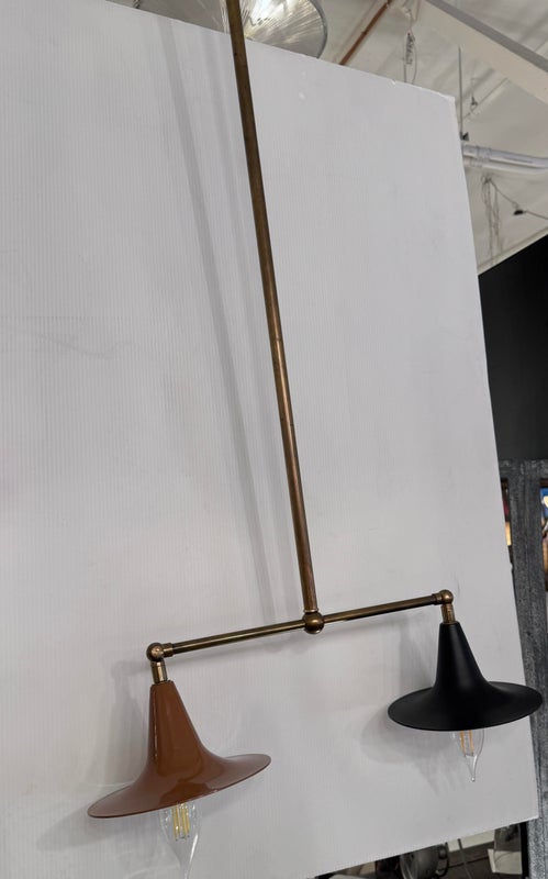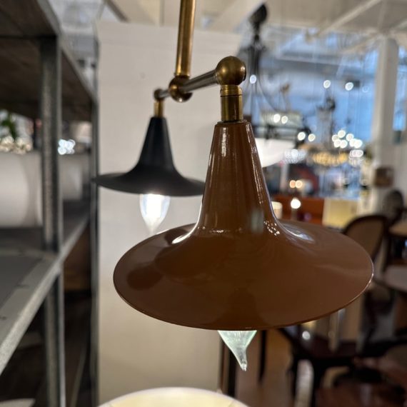 Design Plus Gallery presents a Double Pendant Chandelier from Omega Lighting Company. Omega is known for their ability to custom design their fixtures per customer/client/designer needs. This extra long pendant has brass poles commenting to a brown and black mixed material bulbs of exact same shape/proportions. The fixture is in good condition for its age + use.