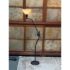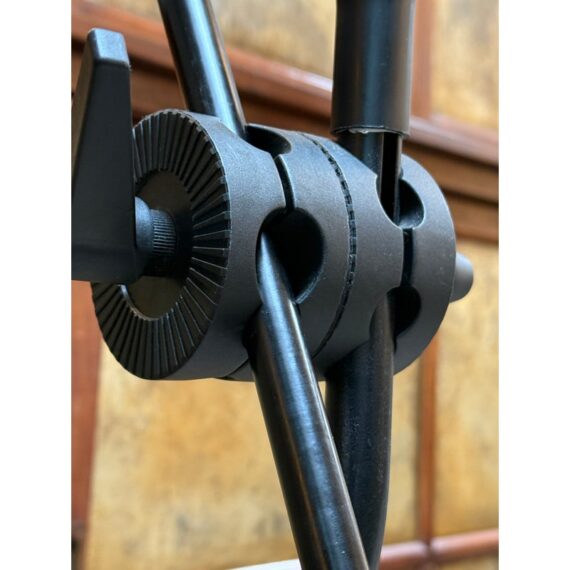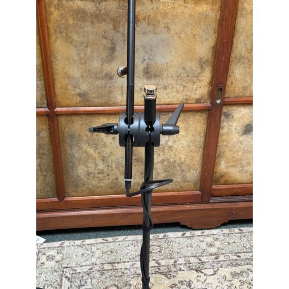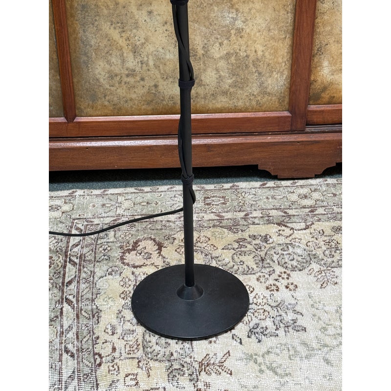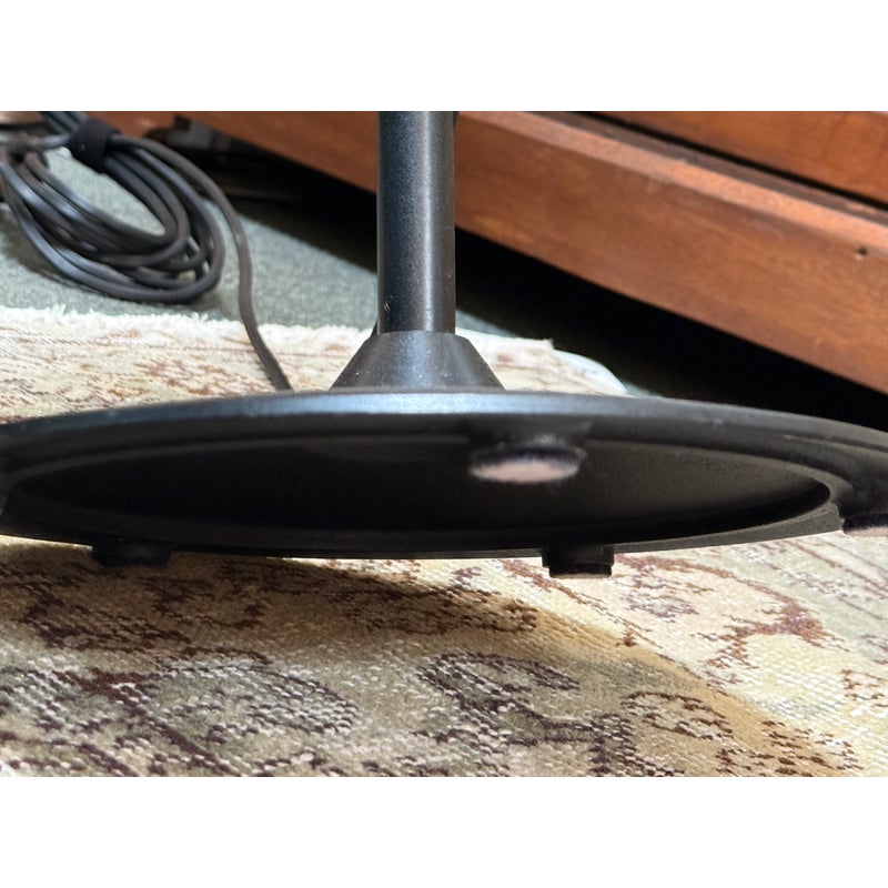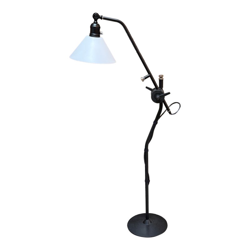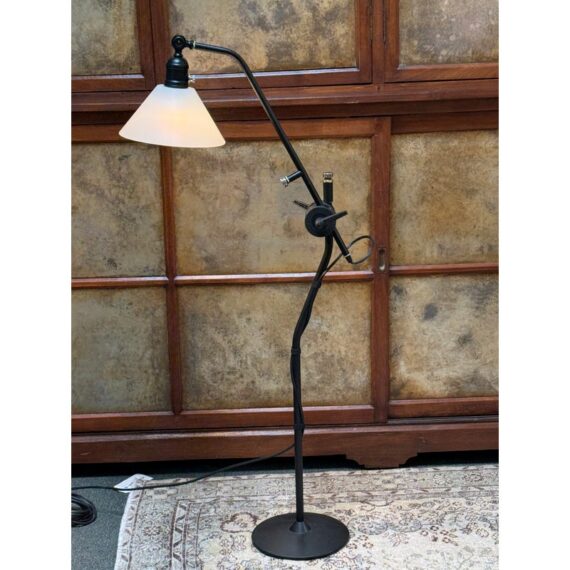 Design Plus Gallery presents a Pivoting Head Floor Lamp. This unique, one of one floor lamp can be used as reading lamp or torchiere as the head can pivot 270 degrees by itself. The arm which supports it is held by a boom clamp and is thus adjustable for both forward-and-back tilt and side-to-side rotation. This makes the main light output highly malleable, while the diffuser shade lets softened light out laterally at the same time. The handles on the boom clamp, once tightened, can be repositioned purely for looks (and without reducing the tightness of the clamp). The power cord on this one is extra-long also, allowing the lamp to be placed far away from the outlet without using an extension cord. It is in good overall condition with minimal signs of visible wear
