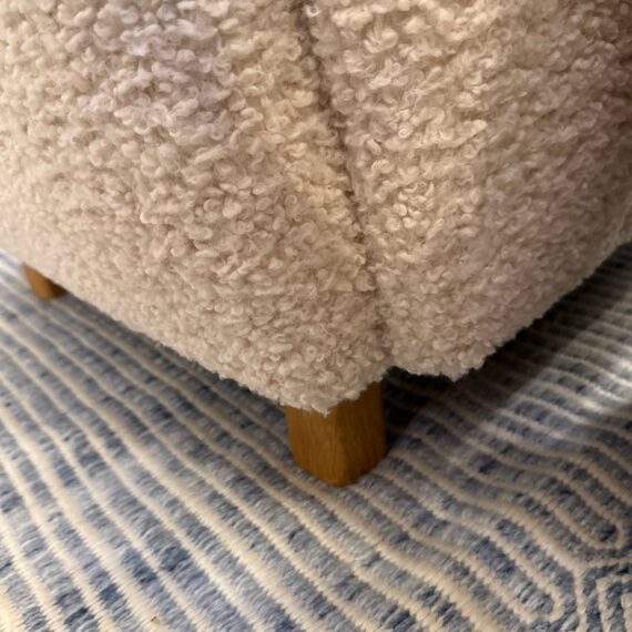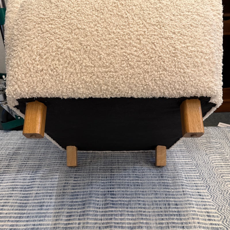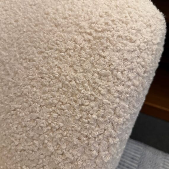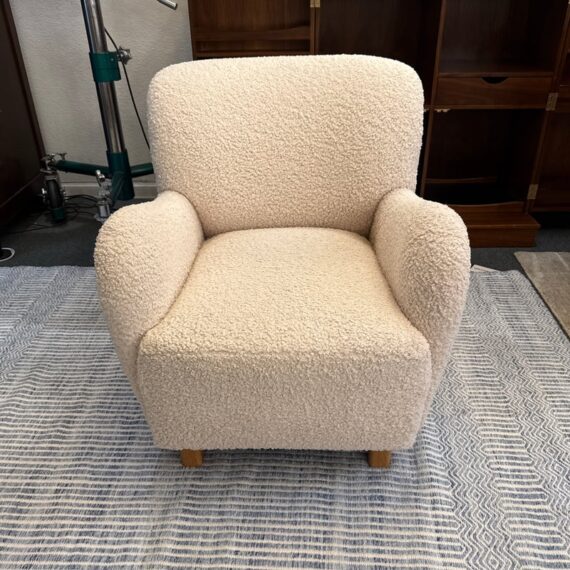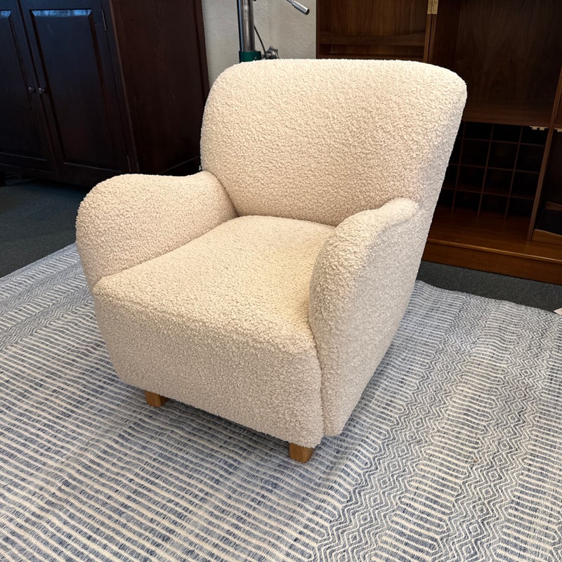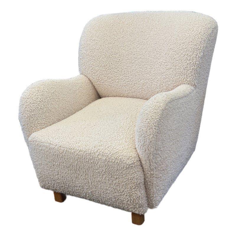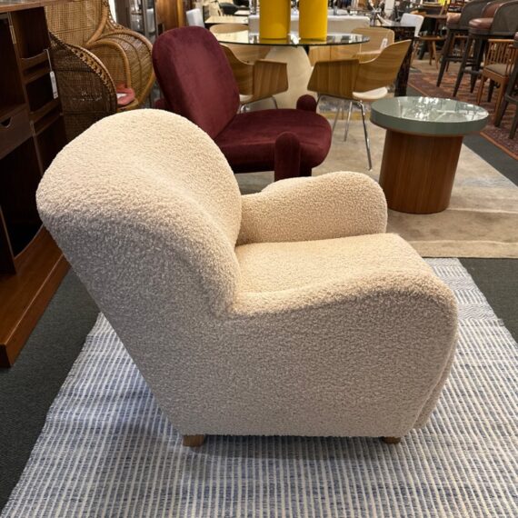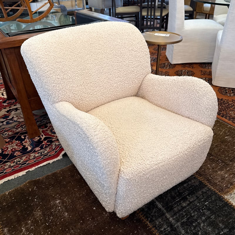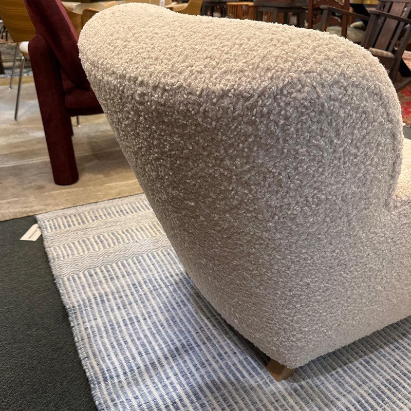 Design Plus Gallery presents Custom Organic Chair. Chair offers a stylish accent to any space. It features a gracefully curved design accented with armrests providing both looks and comfort. The plush texture of the boucle fabric not only enhances visual appeal but invites relaxation, evoking a sense of mid-century nostalgia, infusing any living space with rich elegance. Chair is upholstered in the boucle fabric. The organic modern design of the chair creates an approachable ambience, blending seamlessly with nature-inspired elements in your home. In good condition, visible and minimal wear from usage.