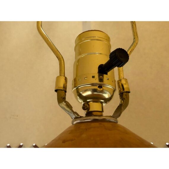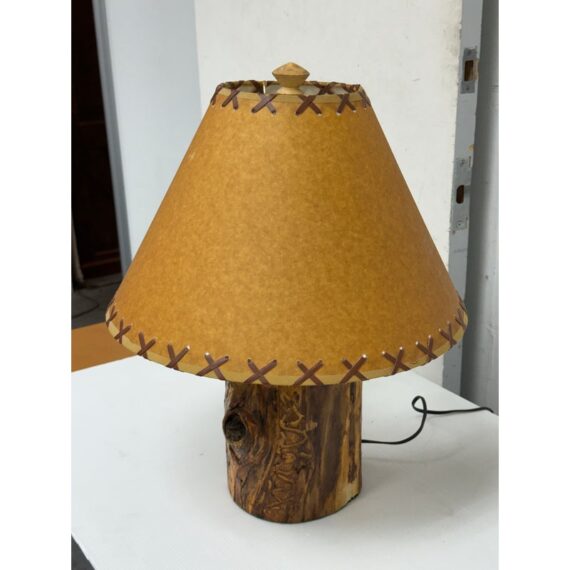 The solid wood base is formed from a naturally contoured section of timber, preserving knots, grain variation, and organic edges that give each surface its own character. Subtle carving and shaping emphasize the natural movement of the wood while maintaining a grounded, architectural presence. A tapered shade crowns the lamp, detailed with leather cross lacing along the top and bottom edges, adding a tactile accent and artisanal detail. The contrast between the earthy wood base and the tailored shade creates a balanced statement well suited to organic modern, rustic, or lodge-inspired interiors. Brass-toned hardware completes the composition, tying together natural materials with thoughtful proportion. In good condition, visible and minimal wear from usage.