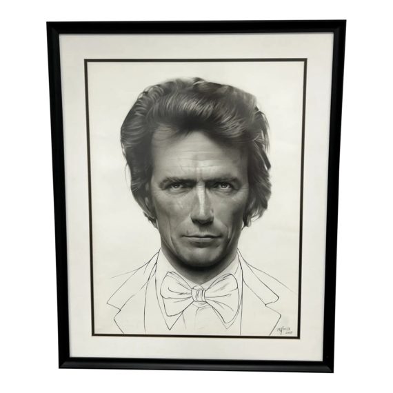 Design Plus Gallery presents a Framed Drawing of Clint Eastwood made in Charcoal. This piece captures the iconic actor/director during his early days in spaghetti westerns, and his transition to becoming an American idol in movie production/directing. The image of his face is of his younger days, with a detailed composition that appears haunting. The outline of a collar and tie is unfinished, leaving the focus on the face. This original piece is signed and dated in 2007 and is in good condition.