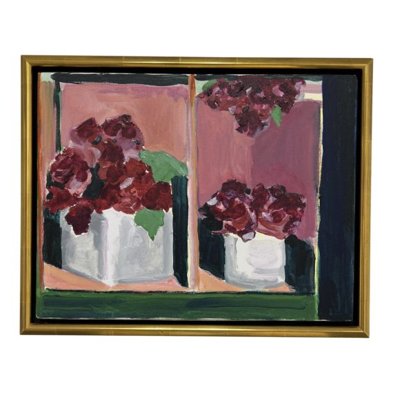 Design Plus Gallery presents an Original Artwork Custom Framed Stretched Canvas Roses in Windowsill Painting. There is an elegant gold frame that sets off the colors of this beautiful painting. The deep red roses are set into two white square vases with a light pink, black, and green background. Very pretty + with wear on the back as the backing paper is lifting.