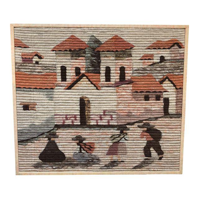 Design Plus Gallery presents a custom framed Peruvian wall Art. This piece was hand woven in Wool. It depicts village buildings in the back ground and four human figures in the fore ground. The colors are soft and muted. it was custom framed using a modeled multi-color molding. It has a very serene sensibility!