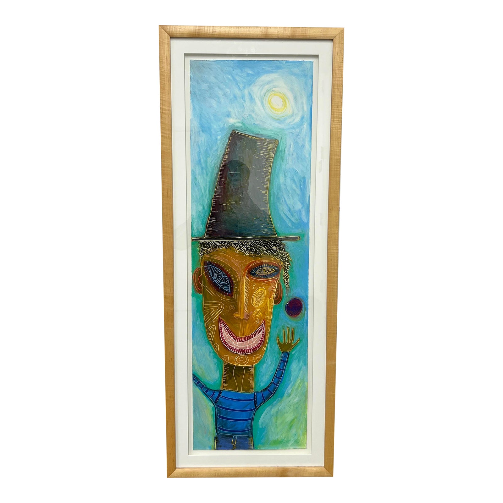 Design Plus Gallery present an Original Artwork, Signed + Dated + Custom Framed Painting. This mildly abstract painting presents a figure in a striped sweater, with blue and yellow eyes. The background is in mostly blue, with a greenish bottom right corner and a sun by the top right. It is framed in a custom wood frame with a rounded front and flat side surfaces. A hanging cord is attached in the back for mounting. Minor wear from use; painting is in good condition.