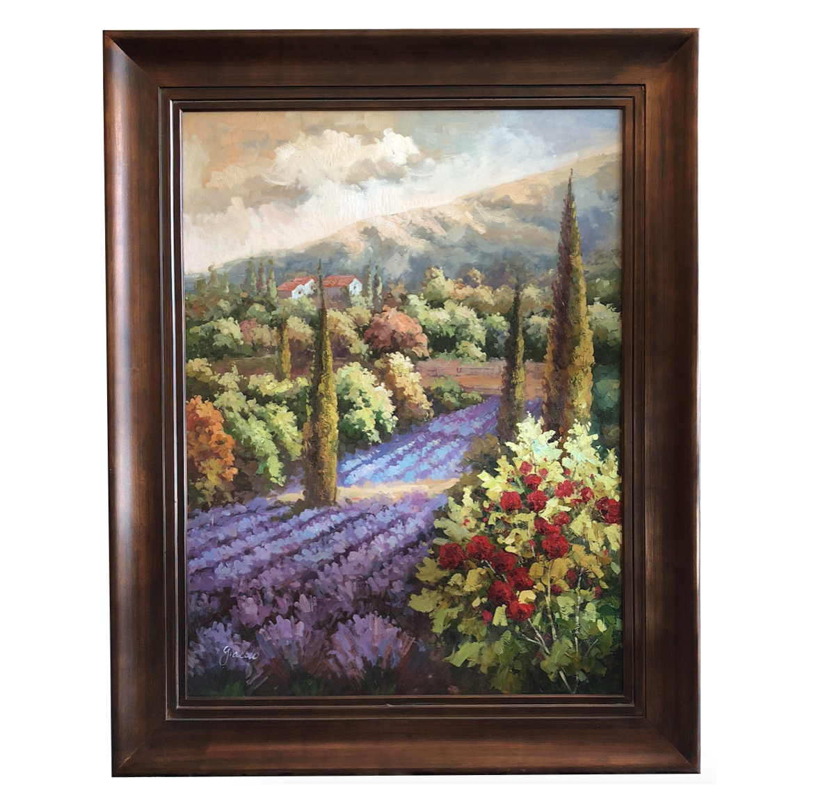 Design Plus Gallery presents a large scale painting, signed by Giacolo. A lush lavender-filled landscape explodes in vibrant color and texture in this five foot visual display. Dark stained frame is rich counterpoint.