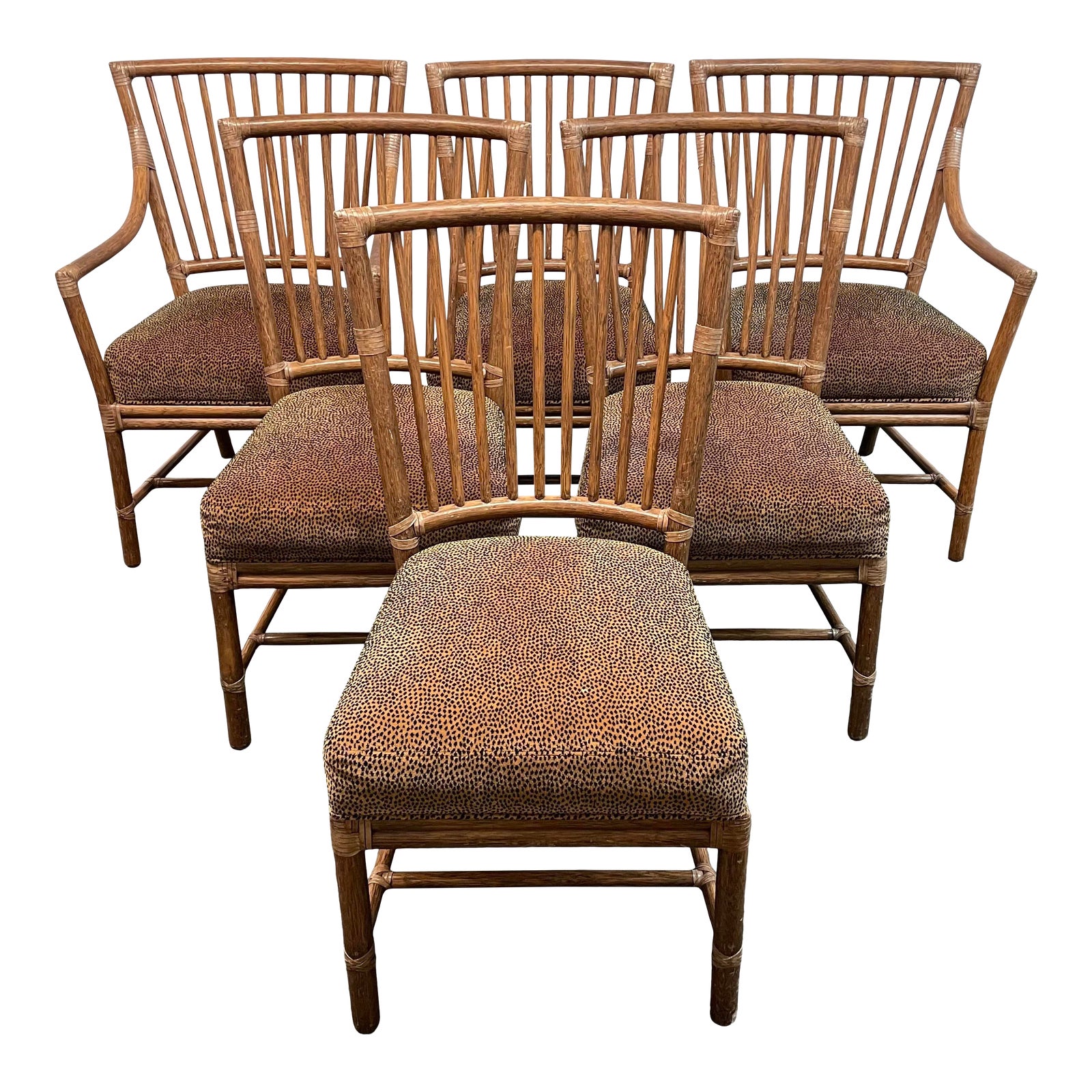 Design Plus Gallery presents a Set of Six McGuire Dining Chairs. Designed by Orlando Diaz-Azcuy, the lovely organic, modern set has a timeless silhouette of iconic leather-wrapped rattan. An allover pattern of black dashes on tan upholsters the thick and comfortable seat cushions. Surface wear on wood frame.