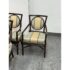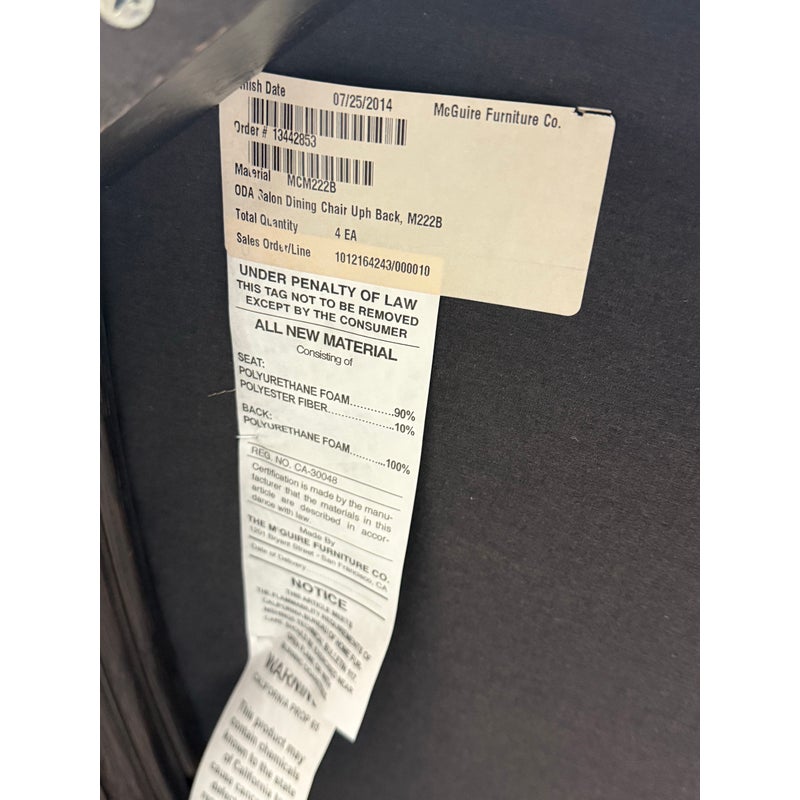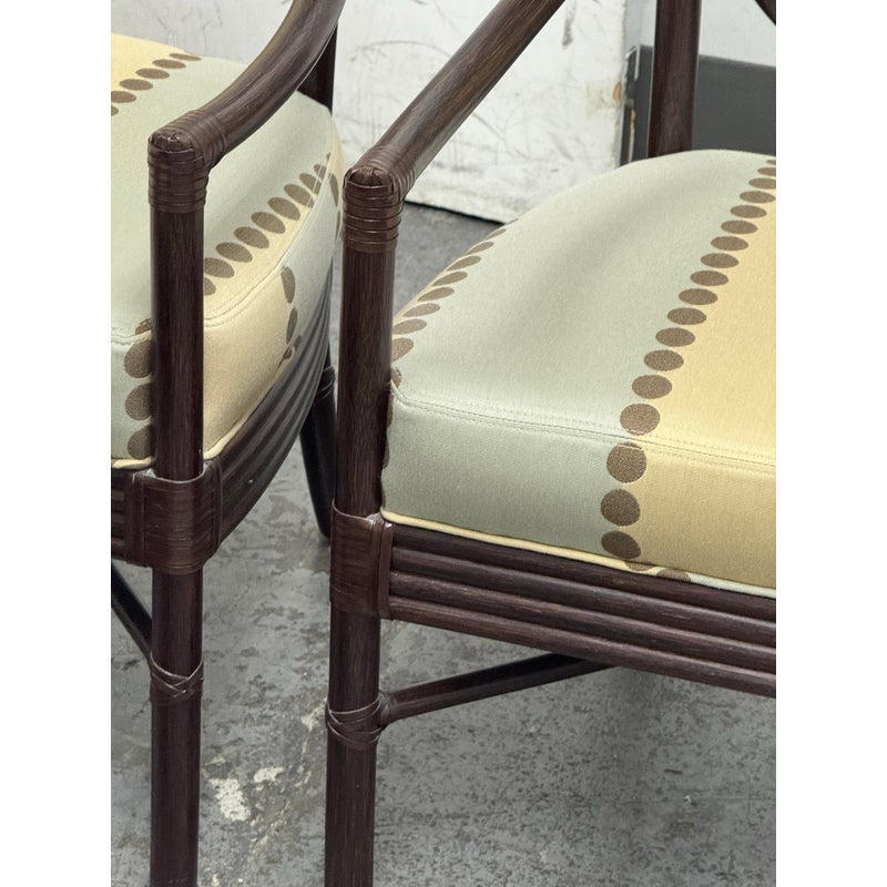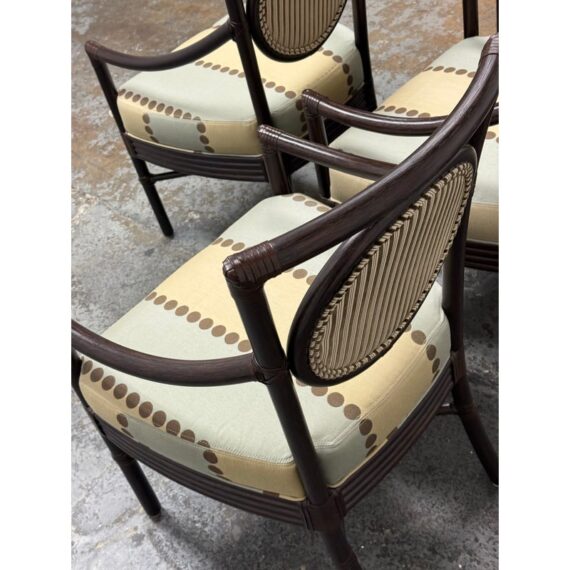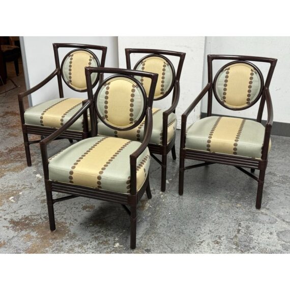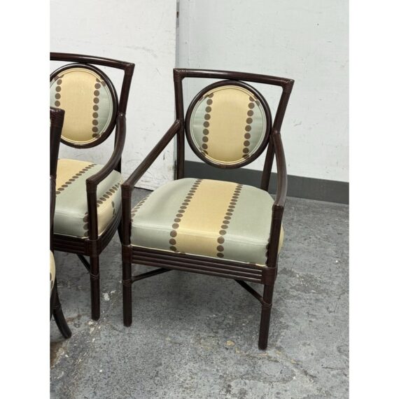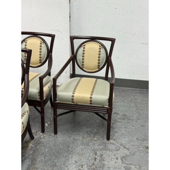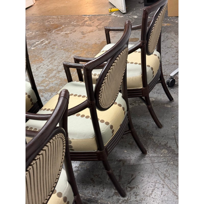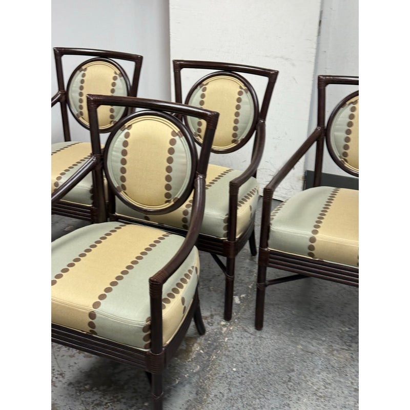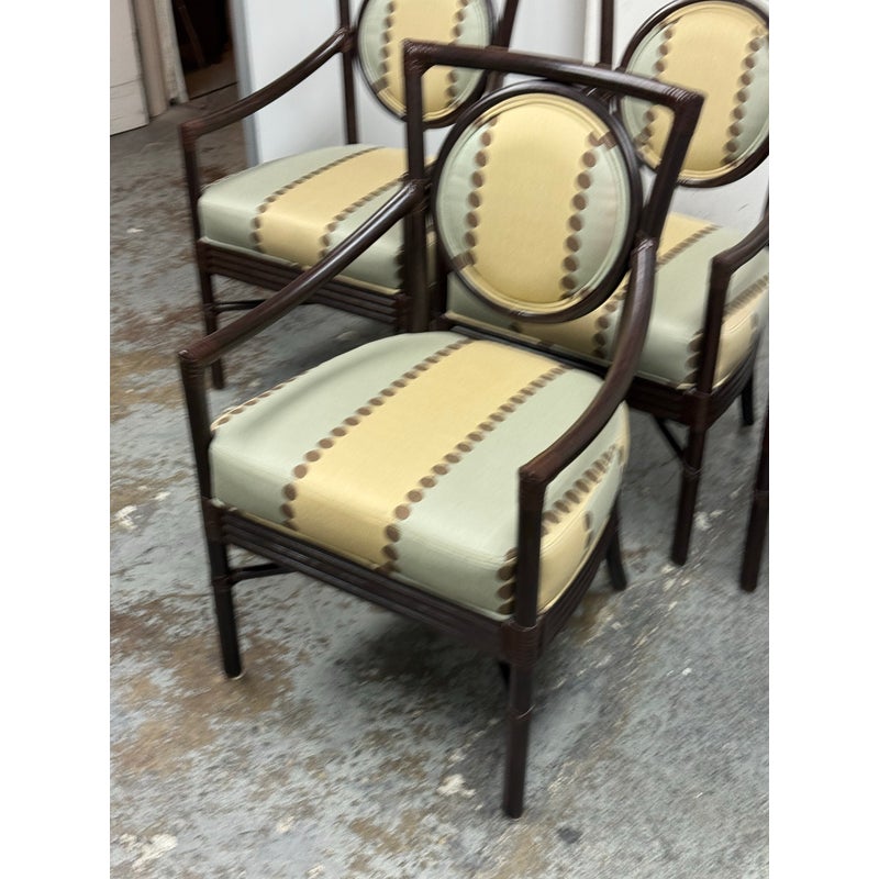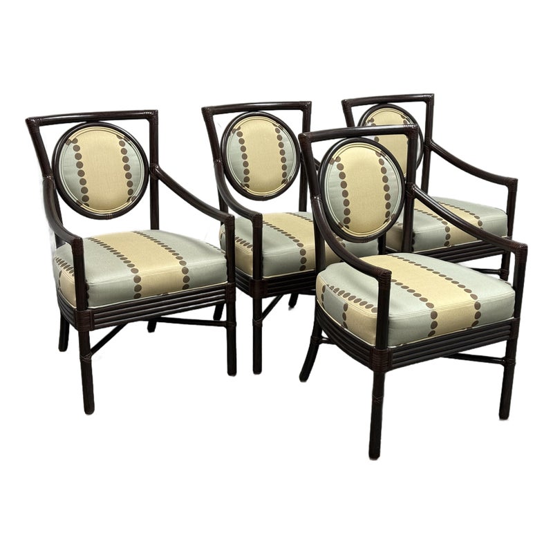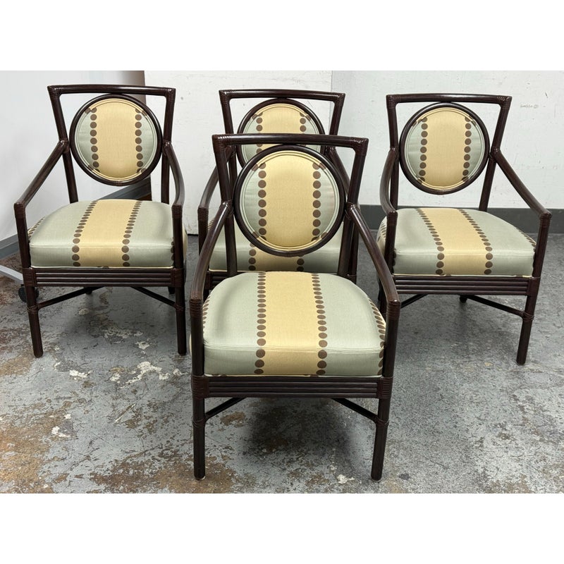 Design Plus Gallery presents a Set of Four Salon Arm Chairs by Orlando Diaz-Azcuy for McGuire Furniture. Elegant and eclectic, the Orlando Diaz-Azcuy Salon Arm Chair features a center rattan ring with either a woven rattan core or an upholstered, double-welted cushion. This center ring is framed by a curved rattan top rail and curved rattan side members that terminate as saber back legs. The dining chair also has gently sloping armrests. A substantial seat cushion is supported by a reeded deck, while an X-shaped stretcher is mounted high under the seat to give the illusion of floating. Custom choice of upholstery + finishes with a tobacco stain. Overall the chairs are in good condition for their usage.