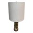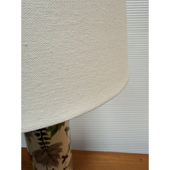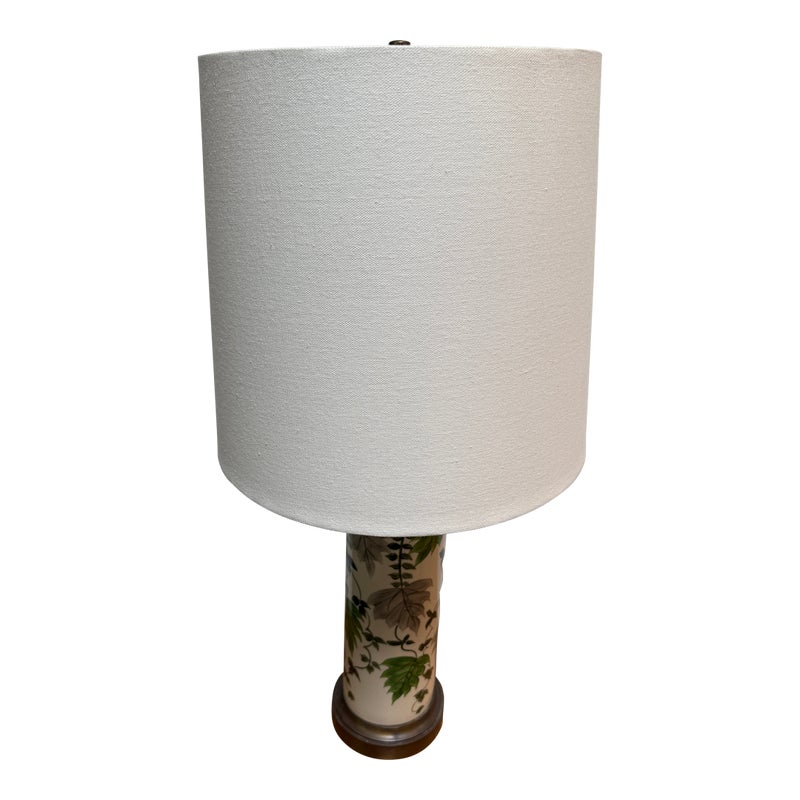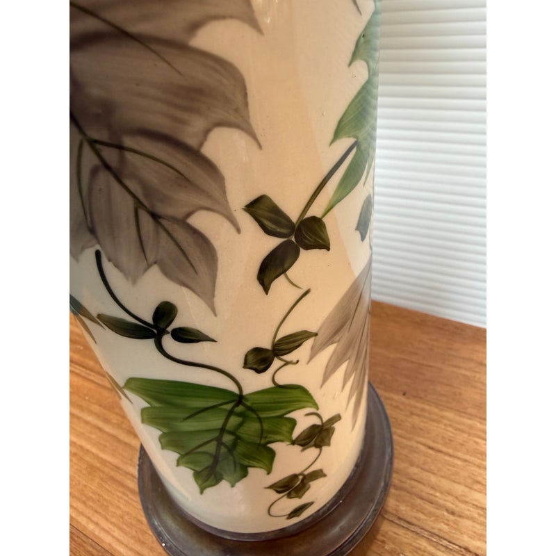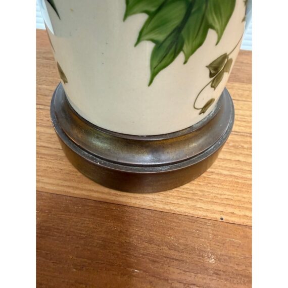 Design Plus Gallery presents a Hand Painted with Leaves Table Lamp from Orlando Pottery. Everything from Orlando is hand built or wheel thrown and decorated by one or all of them at the studio. The table lamp has an off-white background with gray and green tree leaves painted all around its cylindrical form. It rests on a heavy patina brass base that dates the piece to the late 20th century. Other than the wear to the metal the table lamp is in good overall condition with signature of brand on its ceramic base.
