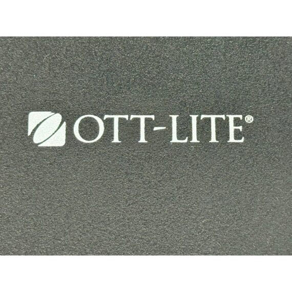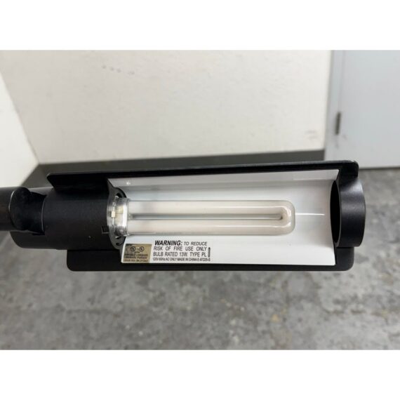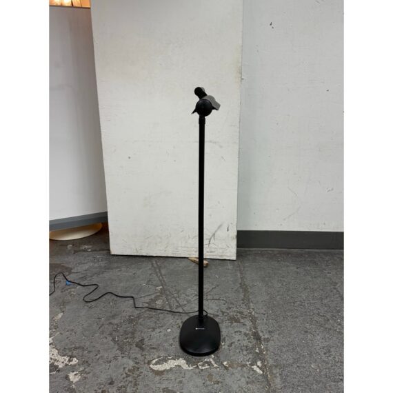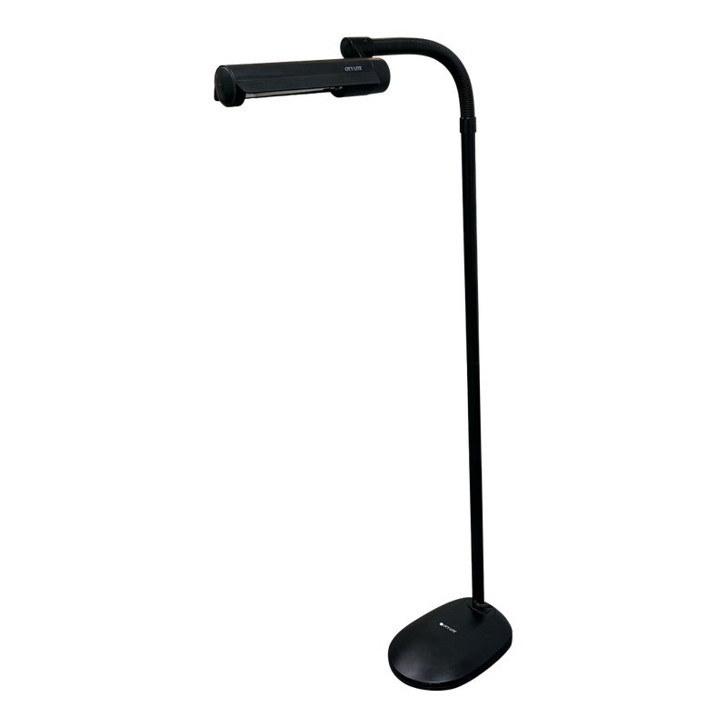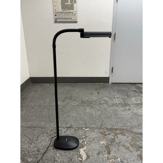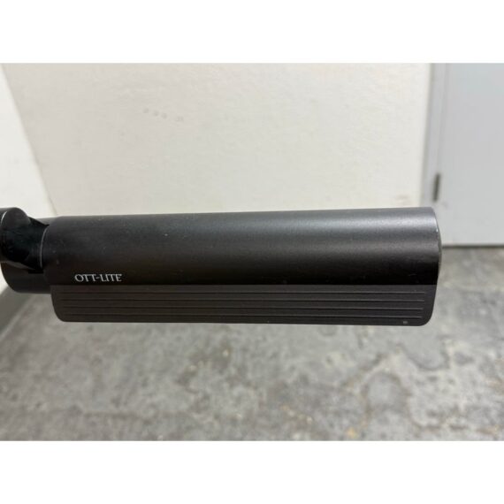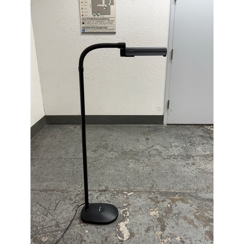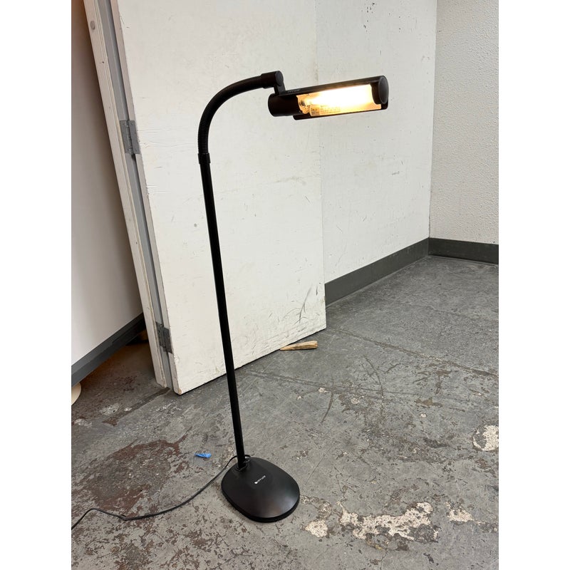 Design Plus Gallery presents a Black floor lamp from OTT-LITE. This Vision Saver model has a slender black post, an elongated cylindrical shade, a flexible neck, a rotating head, and an oval weighted base. It includes an 18-watt True Color bulb rated at 930 lumens for up to 10,000 hours, and it measures approximately 62 inches in height. It is in good condition with visible and minimal wear from usage.