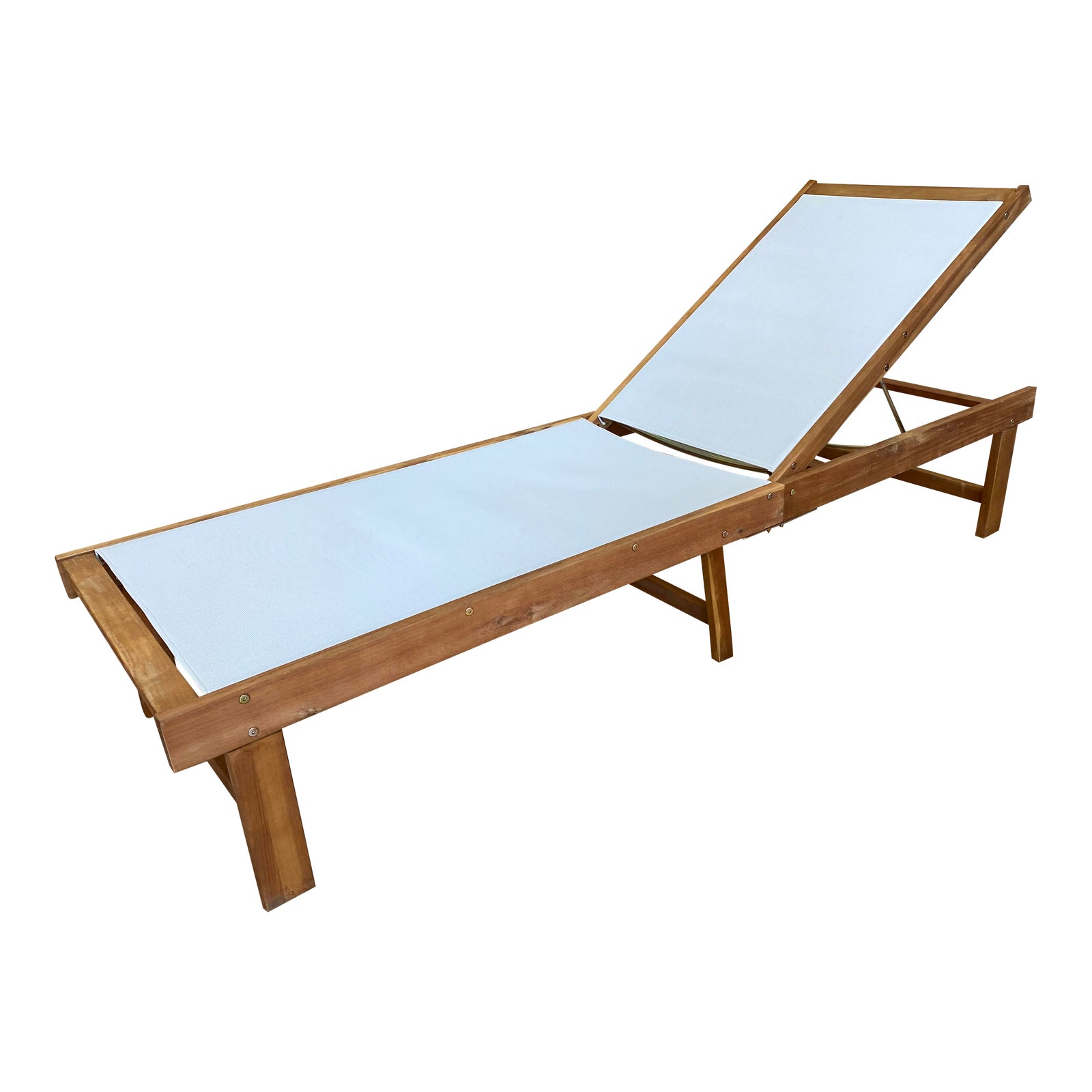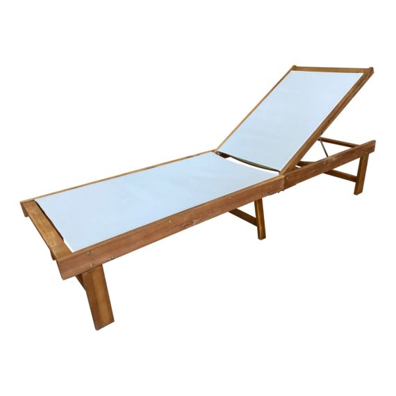 Design Plus presents a Outdoor Chaise Lounge. Teak wood frame with ivory mesh material can easily fold in half for convenient storage. Minor wear on surfaces. Nice to have on stand by on a beautiful sunny day.