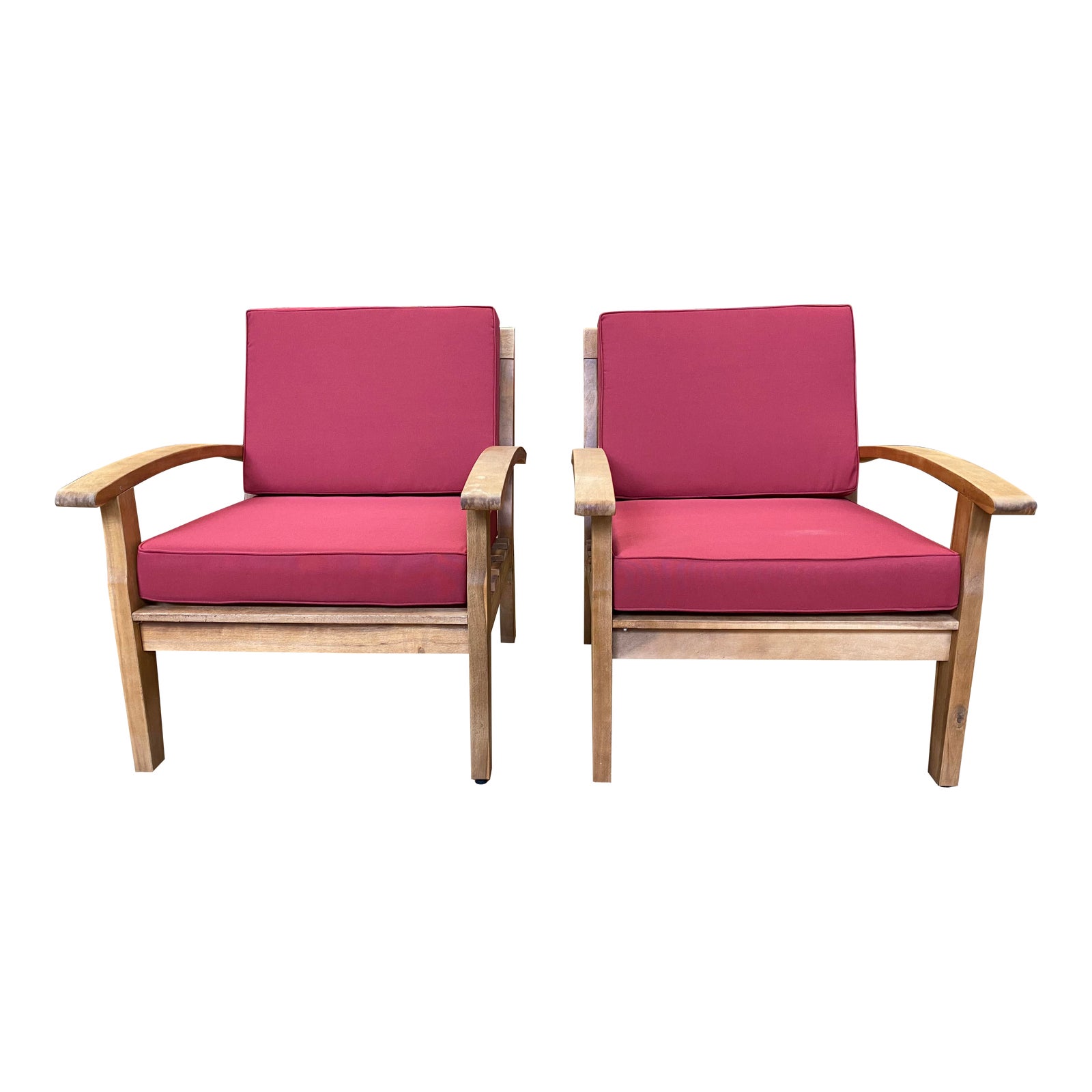 Design Plus Gallery presents a Pair of Outdoor Teak Arm Chair + Cushions. Solid teak wood frame is structured with panels and slender milled arms. Over time wood will turn a silver tone from elements. Outdoor insert and sunbrella fabric is used for the seat and back cushions. Minor wear.