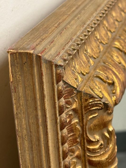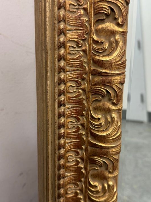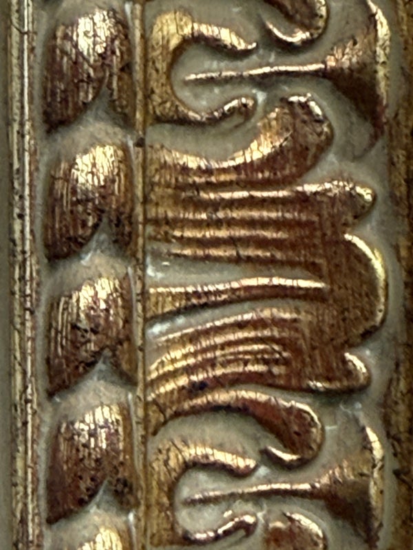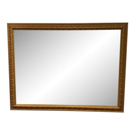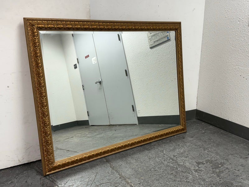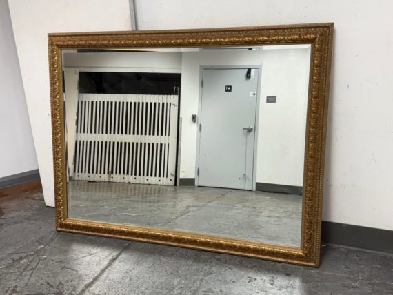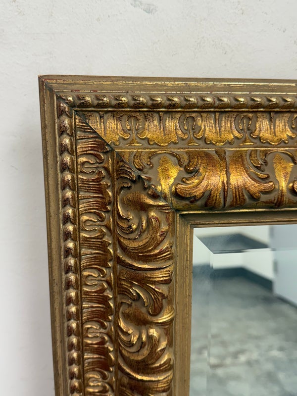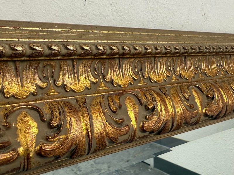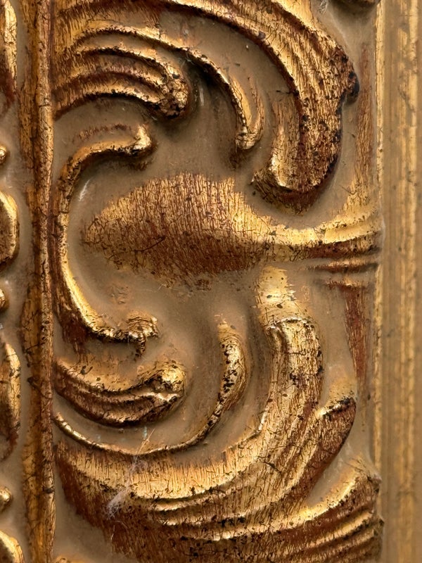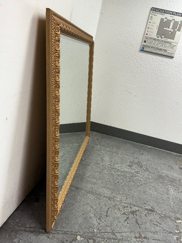 Design Plus Gallery presents a Vintage Age Ornate Frame Over Mantle Mirror. The gold painted frame has old world styling to present boldly on the wall or for its grandeur typically above a mantle. The mirror itself has a bevel inset and all parts are in good condition with wear that is consistent with usage.