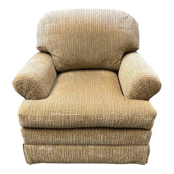 Design Plus Gallery presents an Overstuffed Occasional Chair to kick back and relax in. Nothing makes you want to curl up to a good book or favorite show like a velvety comfy cozy chair. The chair has an animal print like pattern with burn out velvet upholstery. There is sun damage but overall in good condition.