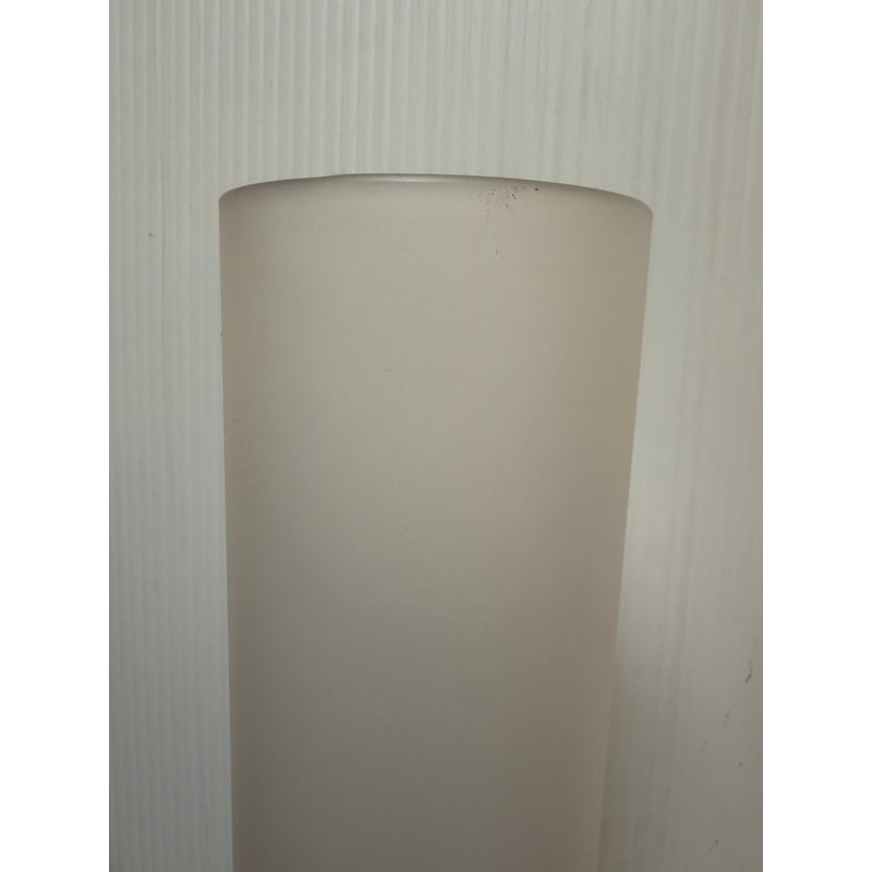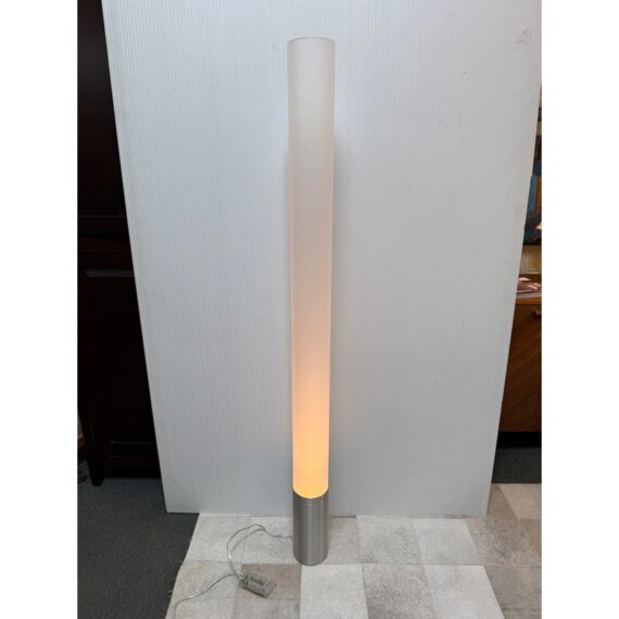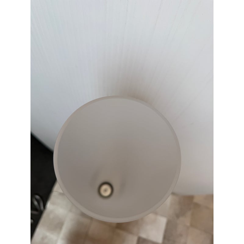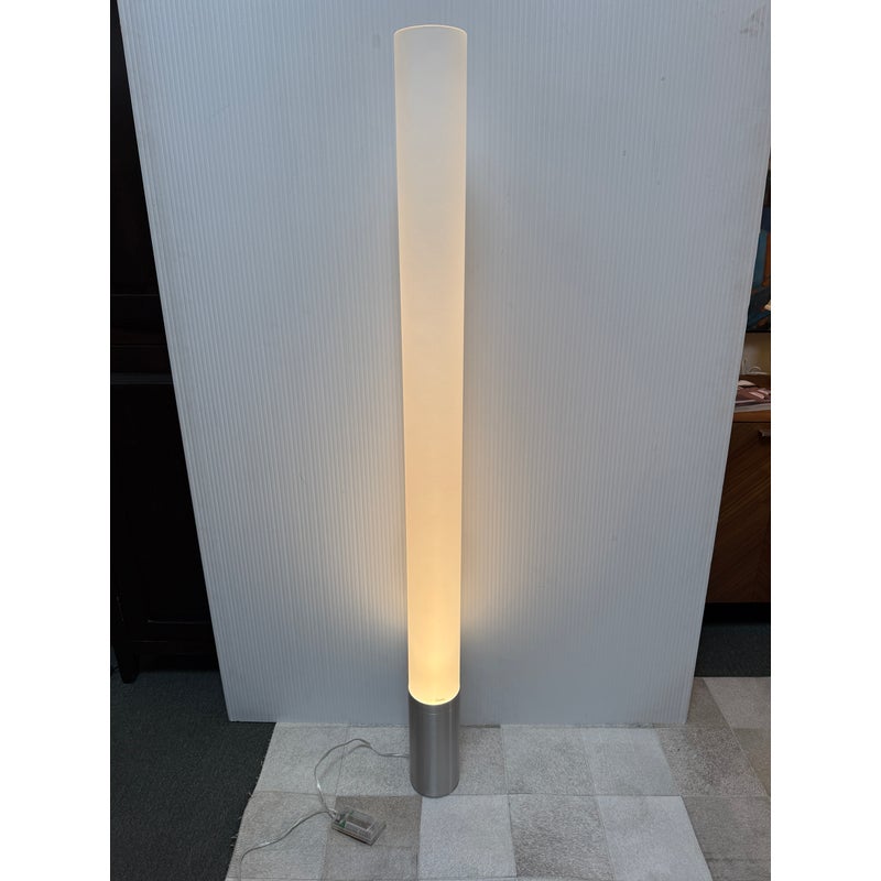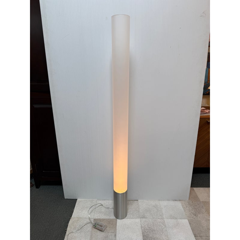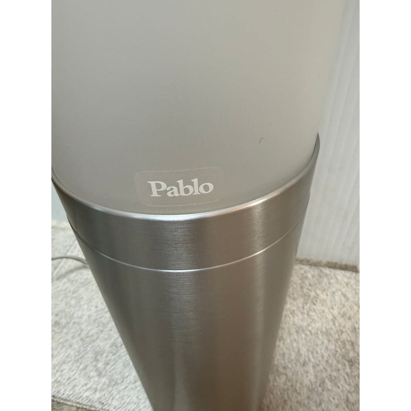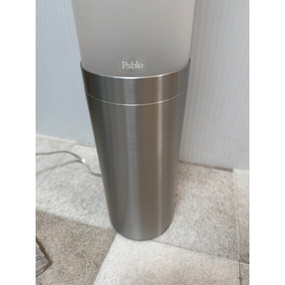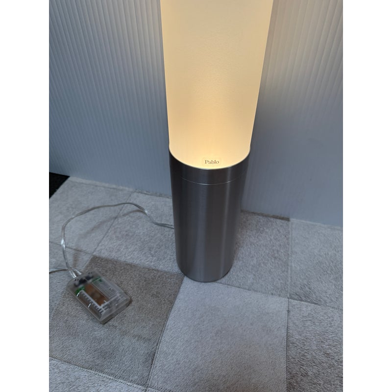 Design Plus Gallery the Elise Floor Lamp from Pablo Designs. This floor lamp is in the brands frosted white with silver color way. The shining aluminum base complements the bright light that is softened with the towering frosted acrylic diffuser to provide balanced illumination. With a full range of dimming control, change the mood in seconds for an appealing feature. It is in good condition for its usage. Made in the USA.