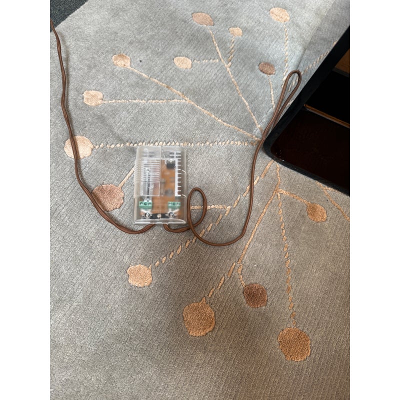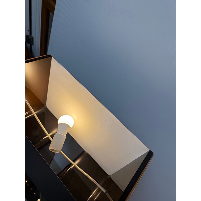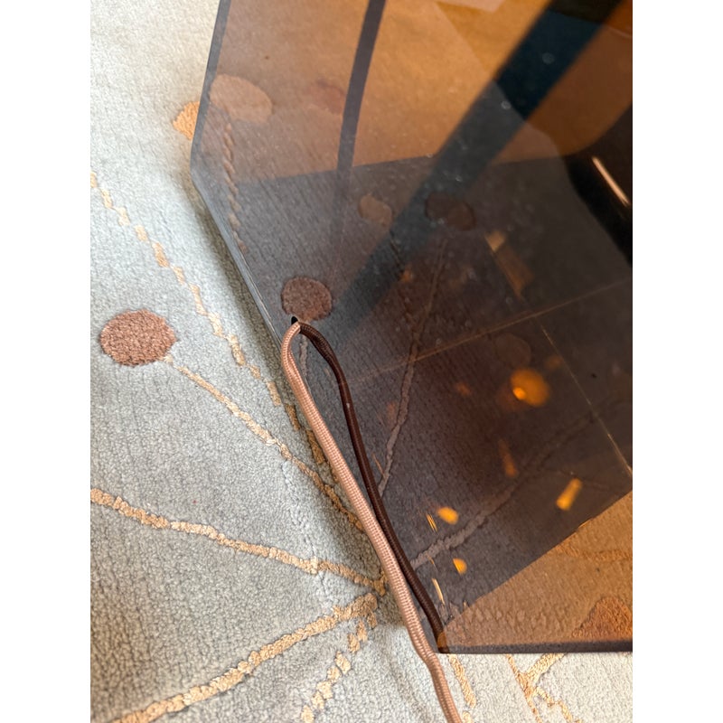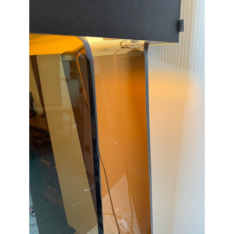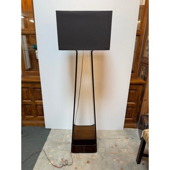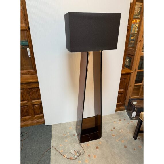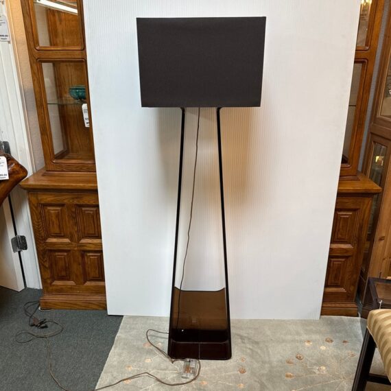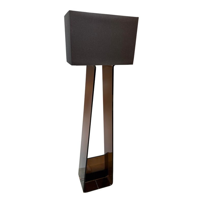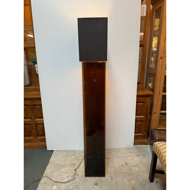 Design Plus Gallery presents a Pablo Pardo Acrylic Floor Lamp. Designer Peter Stathis’ Tube Top Floor Lamp is an elegant minimalist riff on the classic floor lamp, and produced by San Francisco-based Pablo Designs. The wide ribbon of brown lucite bends in the center to create a base, like a piece of sculpture. The black shade wraps around the acrylic silhouette at the top and a full-range dimmer switch to fill your space with the perfect amount of LED light. Light surface wear; condition is consistent with age and use.