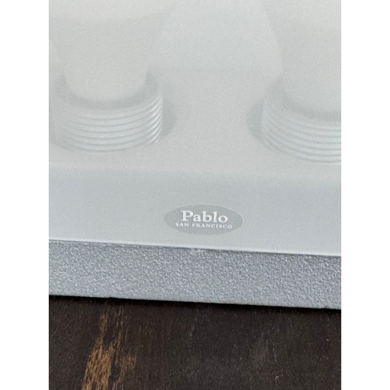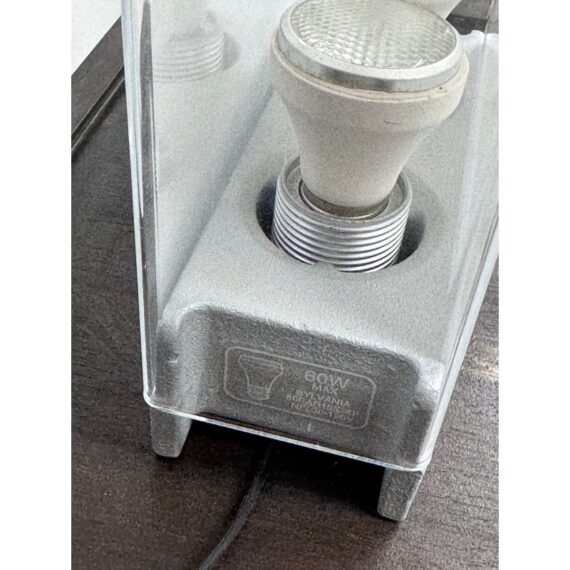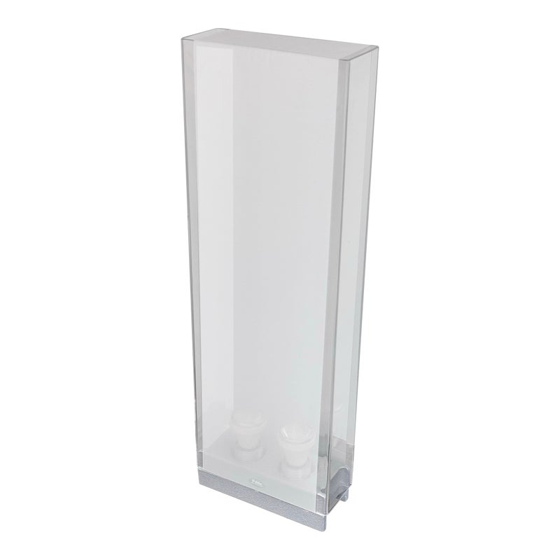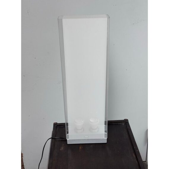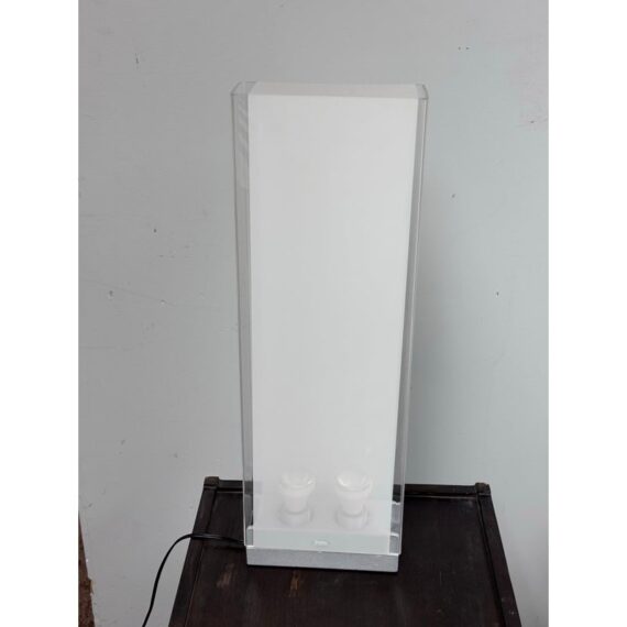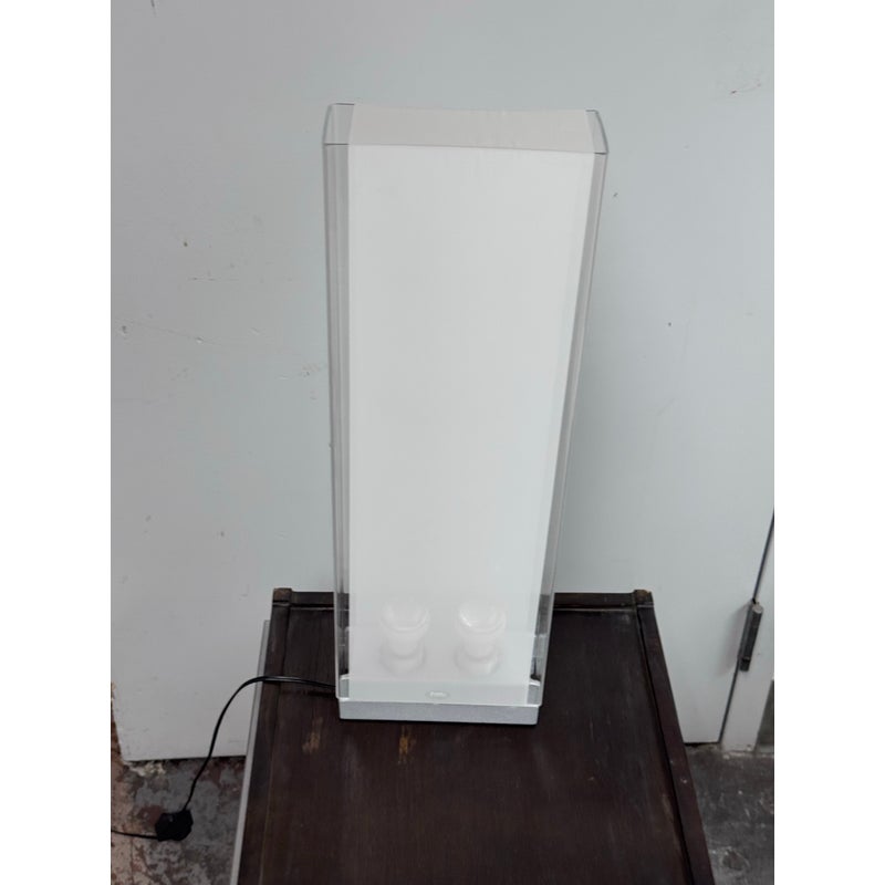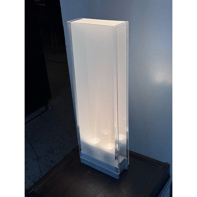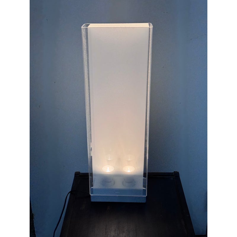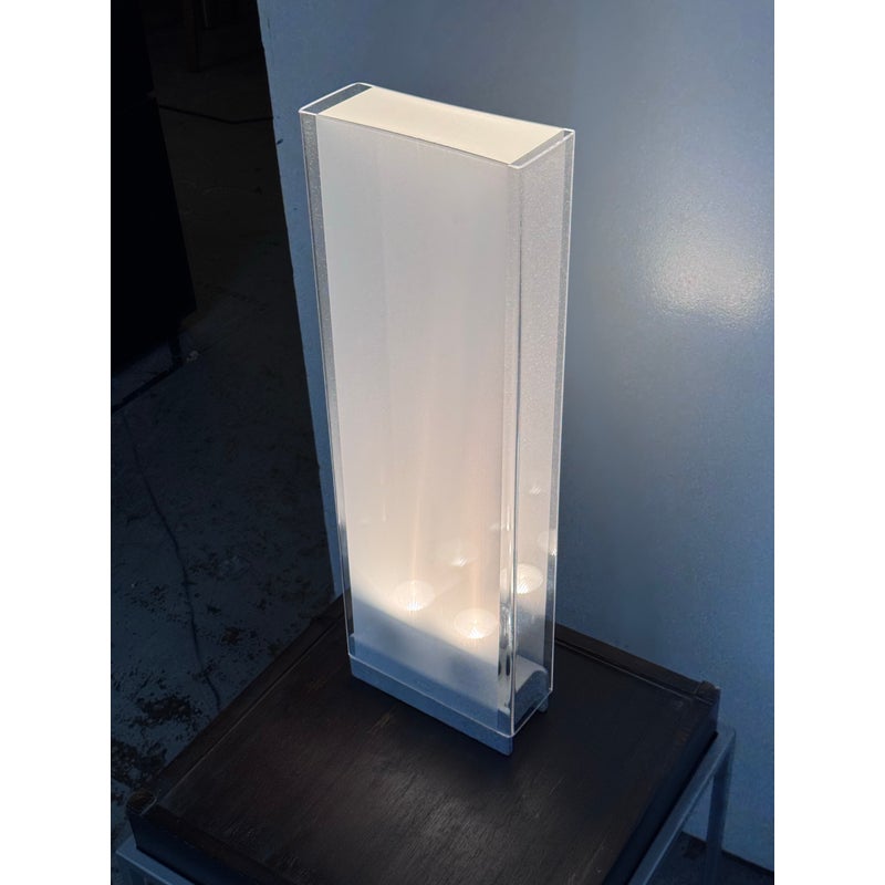 Design Plus Gallery presents Cortina Table Lamp by Pablo Designs. Designed by Pablo Pardo. A sculptural luminaire that emits a seductive light through its transparent and diffused surfaces. Cortina’s monolithic form factor creates a noble light that mimics its architectural surroundings. Fluidly dimmable, the piece is comprised of a clear acrylic shade and a translucent fabric diffuser to shield the upward-facing light source. In good condition, minimal wear.