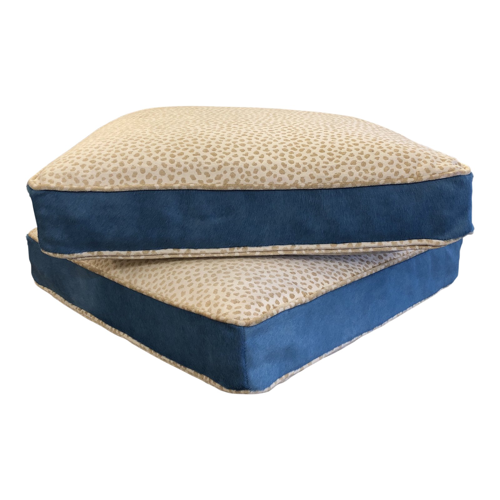 Design Plus Gallery presents a Pair of Custom Floor Pillows. With reversing color animal print on front and back, the large pillows are bordered by self welting and rich blue suede for impact. Down wrapped cushion fill.