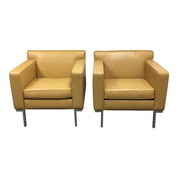 Design plus gallery has a pair of Theatre Chairs designed by Ted Boerner. A Design Within Reach Exclusive. The upholstered is a Camel Leather. With a gently angled backrest, full seat depth and elevated armrests, Boerner’s signature artisanal details are evident throughout. A gleaming chromed steel base runs the entire depth of the design, and welted seams lend strength and definition to the upholstery. Made in U.S.A. Arm Height: 26.5, Seat Height: 19″,