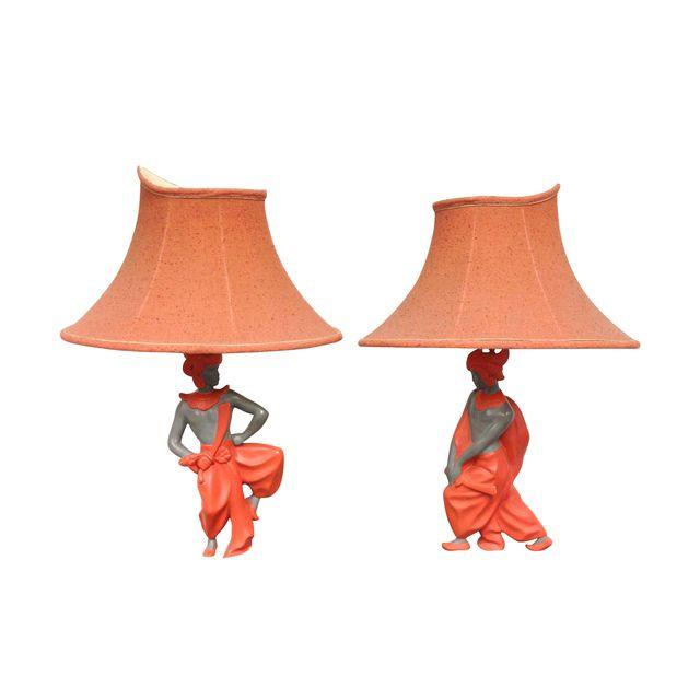 A pair of 1960’s Mid-century Warrior lamps. The warrior base men are grey and bold orangish-red, designer with detail they supported by a good structure and hold a burnt orange shade that is an oriental style. Let these two warriors perfect your home and let them create a good feng shui into your space. let them light up your home.