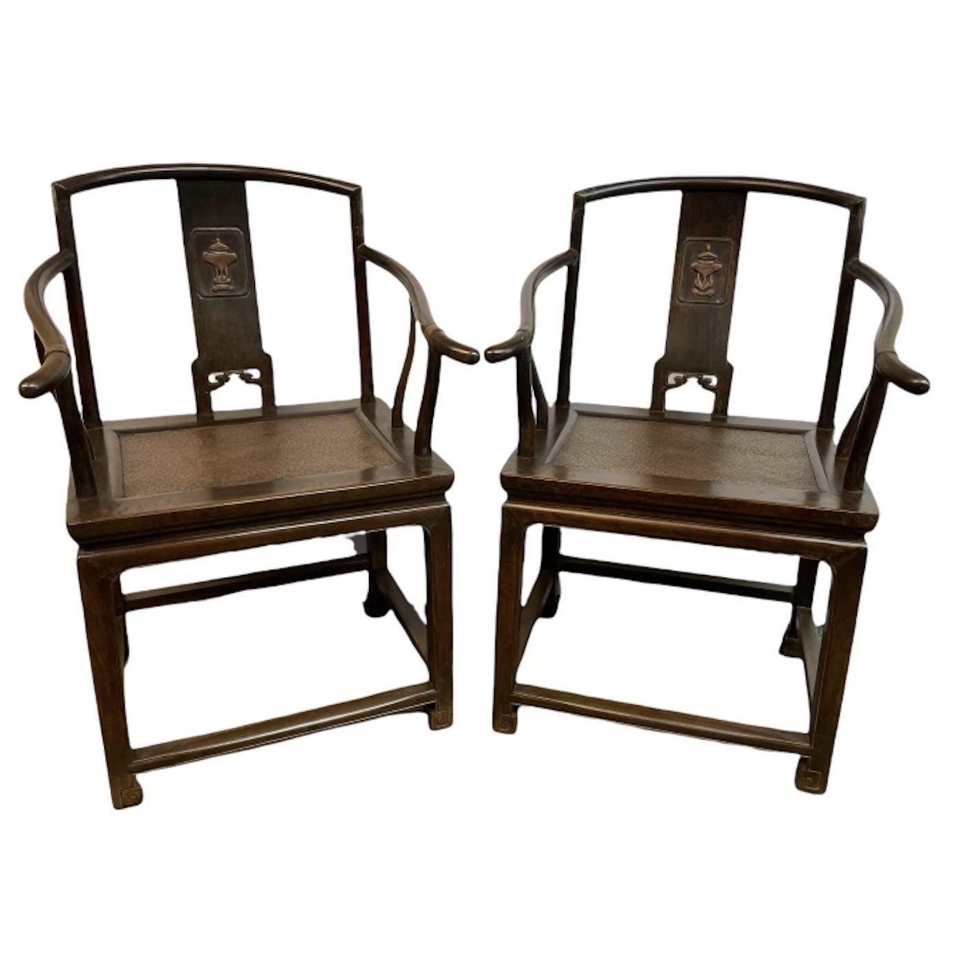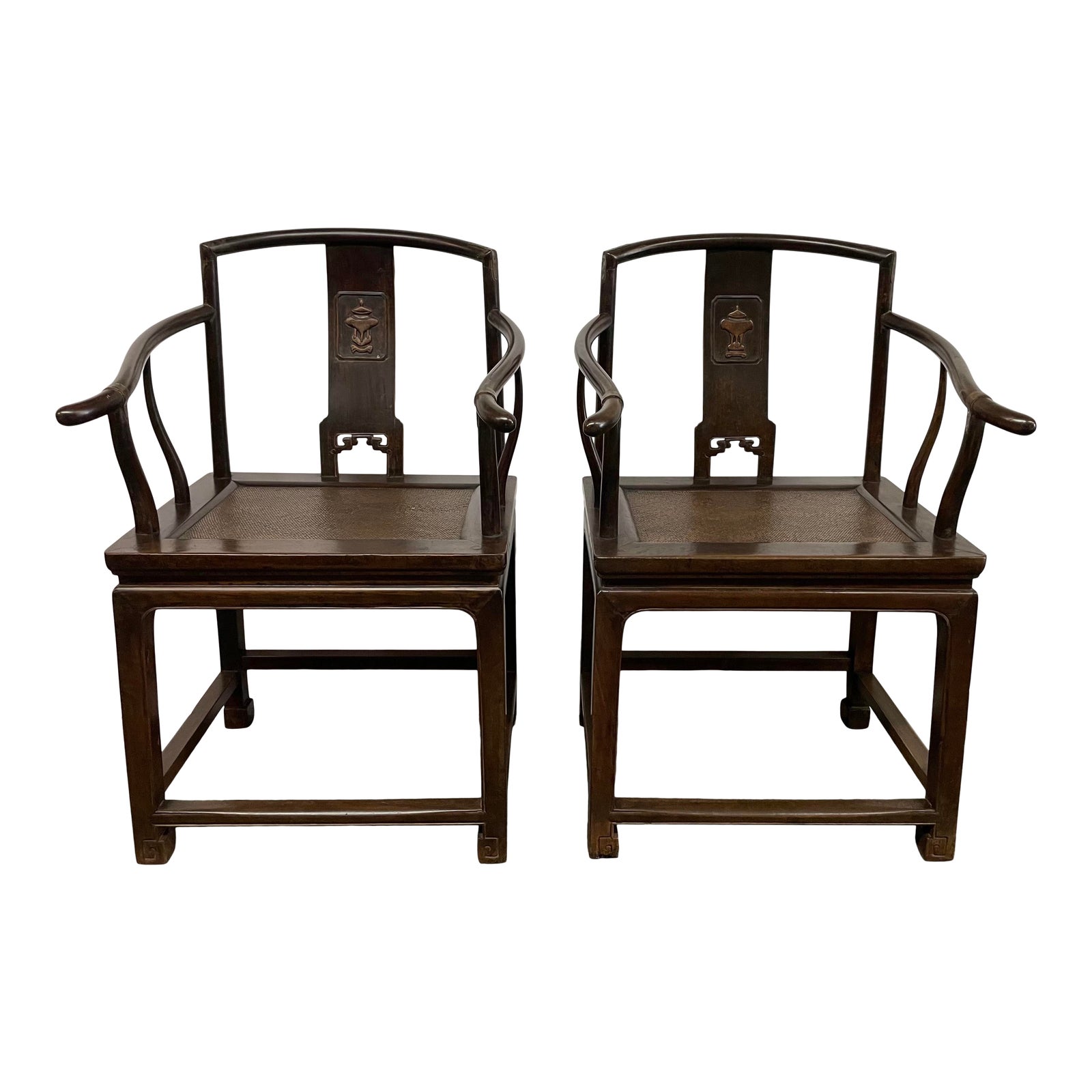 Design Plus Gallery presents a Pair of 19th Century Chinese Lowback Chairs. Solid elm joinery stands the test of time with a lovely patina. Curved arms and back supports the splat with a unique incense motif carved into the back. Seat is surfaced with a wicker. Base is reinforced with a box trestle. Visible wear through out is a part of the charm. Pair is in good condition.