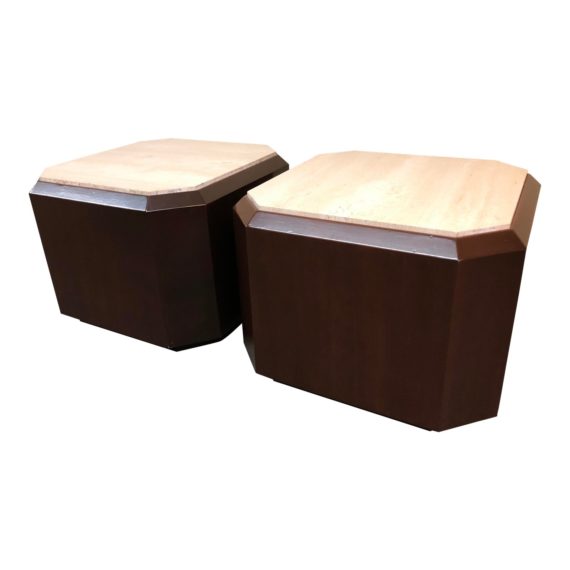 Design Plus Gallery presents a pair of contemporary travertine top end tables. A dark wood finish wraps the rounded octagonal base, making a solid support for the travertine top. The carved stone raises slightly over the edge of the table base, and the cream and beige colors blend well with the wood finish.