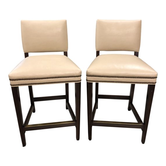 Design Plus Gallery presents a pair of custom counter stools. Handcrafted of solid wood in a dark finish. An upholstered back and seat in cream leather. The seat and back are outlined with a dark antique brass nail head trim. The wood frame has minor wear. The foot rail has an antique brass finish metal wrap. Seat Height: 25.5 inches.