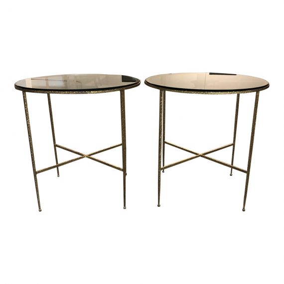 Design Plus Gallery presents a pair of custom side tables. Round framed beauties with textured steels details in a brass finish. Four legs with a x-base joinery. The surface are round glass inserts. Can be used as side tables or nightstands.