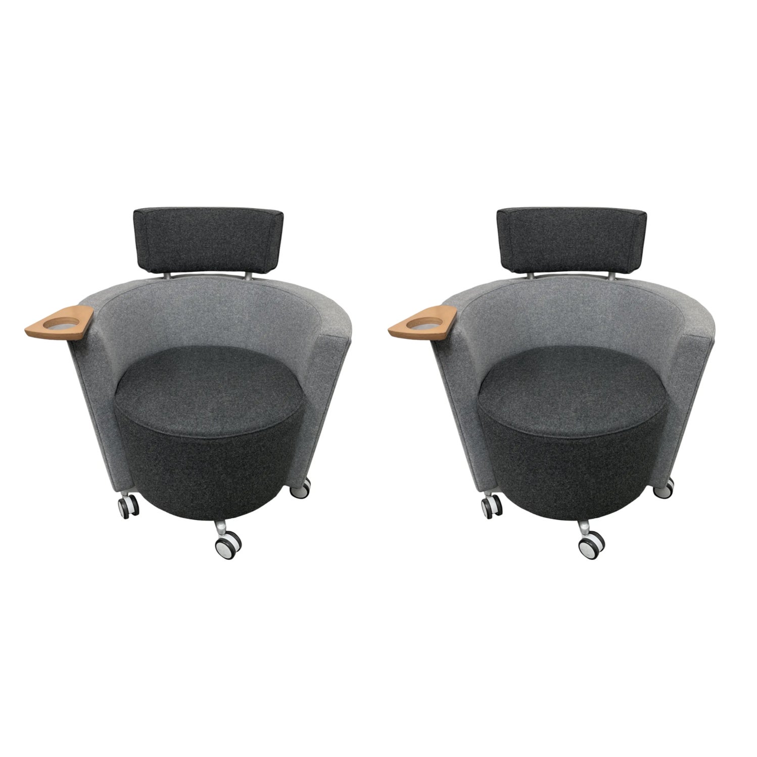 Design Plus Gallery presents a Hello Mobile Lounge Chairs for Haworth by CSD Studio. The circular shape of Hello mobile lounge seating embraces you in comfort as the swivel base maneuvers with the agility of a task chair. Well-defined edges balance soft roundness in the design. Creates a fun and flexible atmosphere for collaboration and creativity. Passive lumbar back support with exposed casters. Interior frame constructed with glue-and-dowel joints, reinforced with screws and cleats. The Mobile option features a 360° swivel base. On the right arm, there is a small swivel cup holder. Minor wear on surfaces, chair is in good condition. Made in North Carolina.