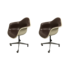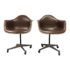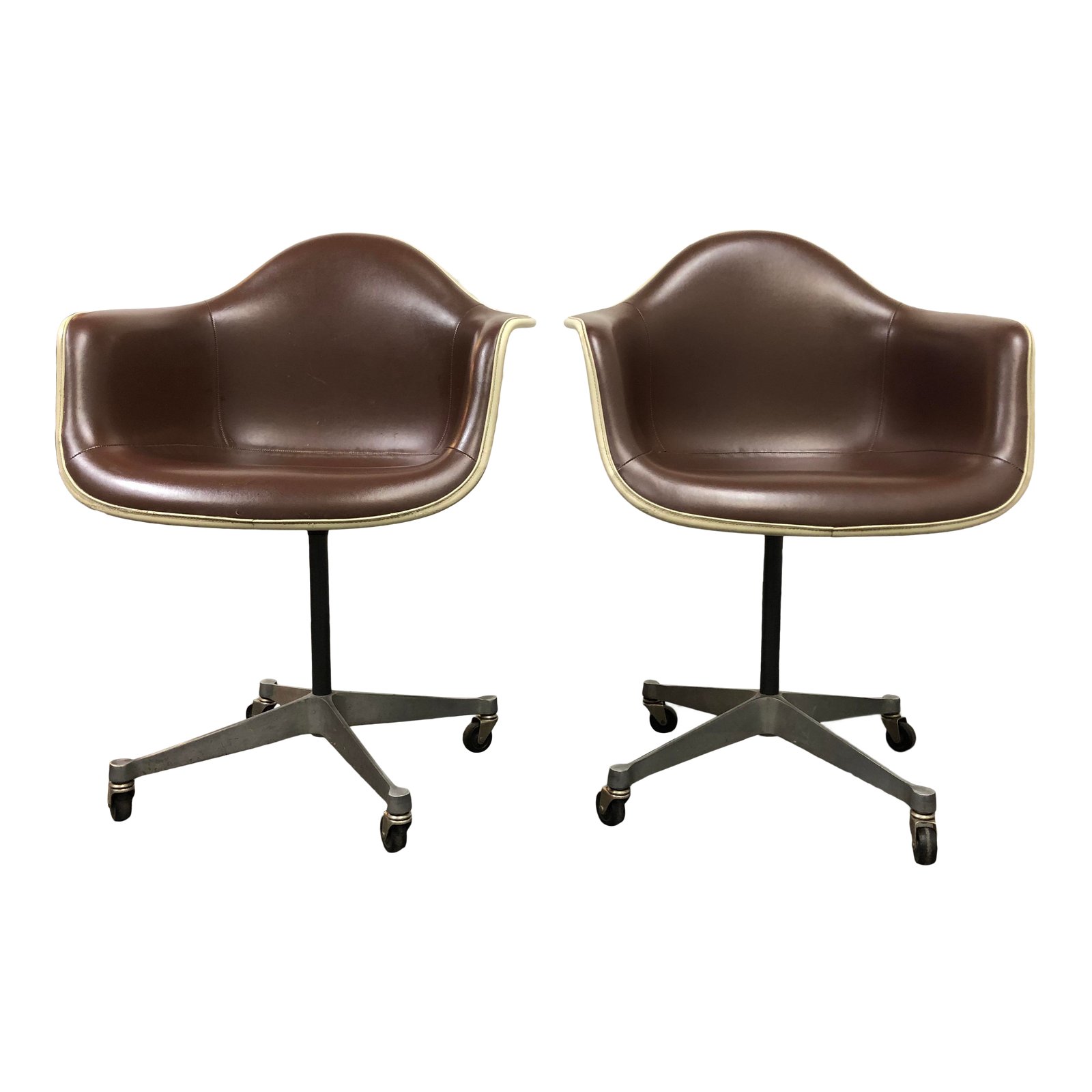 Design Plus Gallery presents a pair of Mid-Century Eames Office Bucket Chairs by Herman Miller. Designed by Charles and Ray Eames. Ivory fiberglass shell swivel chair. Upholstered in and chocolate brown vinyl with ivory pipping. The chairs have steel pedestal with four casters. Visible wear with age. Made in Zeeland, Michigan, USA. Arm Height:28 inches, Seat Height: 20.5 inches.