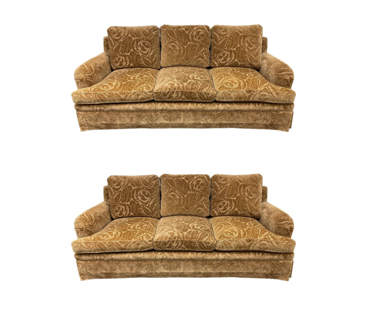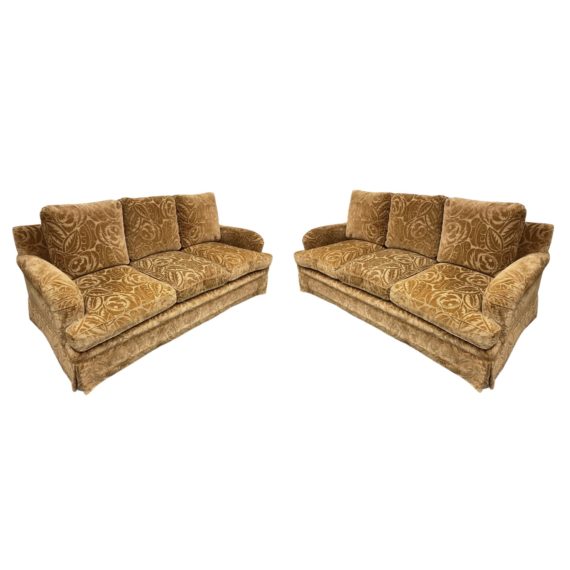 Design Plus Gallery presents a Randolph & Hein Rolled Arm Sofas. Impeccable craftsmanship and monumental scale anchors any room while leaving room for others to shine with the warm and east to blend bronze tone. Fabric is an impressive silk mohair cut velvet. A large scale graphic Deco botanical pattern adorns the varying pile of the complex textile fabrication. Base is skirted and cushions are filled with down. Seat construction consists of eight way hand tied springs. Minor wear on surfaces, sofa was very well take care of and is in good condition. Designed and made in San Francisco.