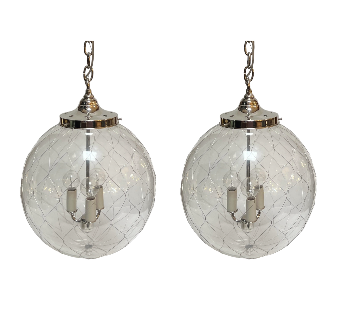 Design Plus Gallery presents the Sorenson Wire Lanterns made-to-order by Remains Lighting Company. A large mouth-blown glass orb is wrapped in handwoven wire fabric to form this unique hanging lantern, which references historical netted glass factory lighting. Suspended from a polished metal ceiling canopy the light has 3 candelabra sockets, maximum bulb 60 watts per socket (not included). Made in the USA. Little evidence of wear; good condition.