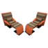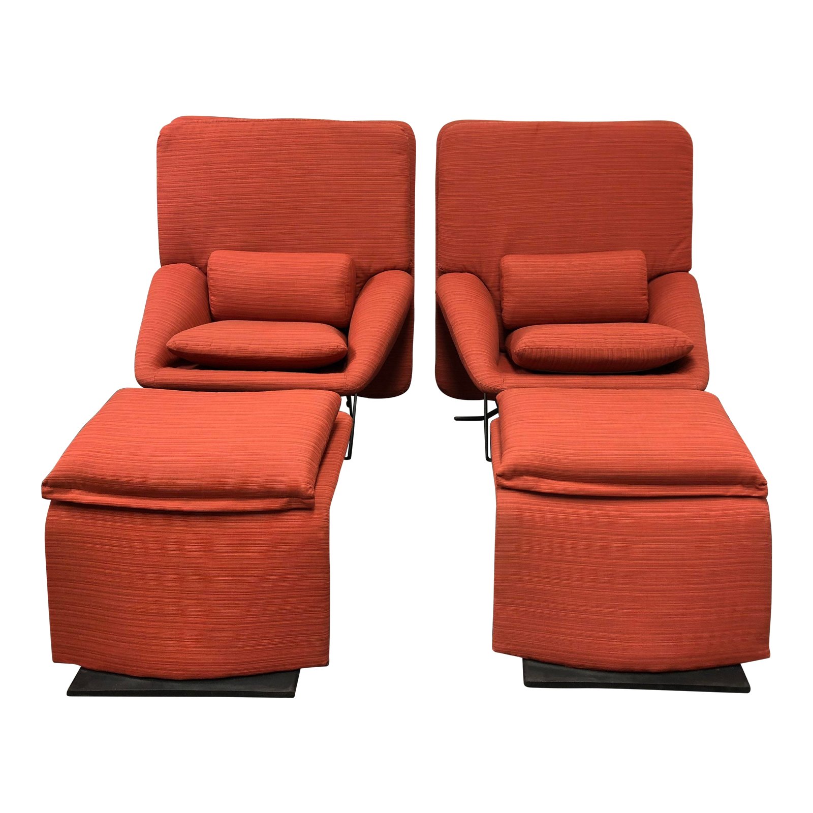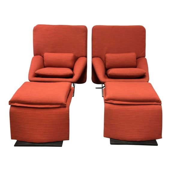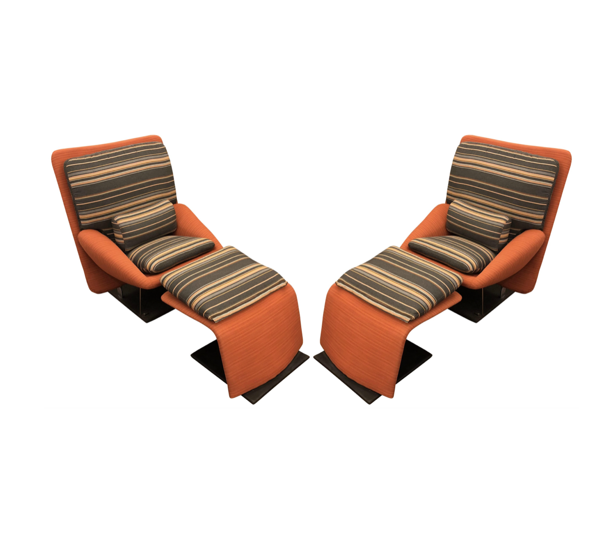 Design Plus Gallery presents a pair of reclining lounge chairs and matching ottomans for Saporiti Italia. Designed by Vittorio Introini in the 1970’s. These beauties have been newly reupholstered in a orange sunbrella fabric. They come with a matching pillow cushion set with navy blue, tan and white stripes. The base of the chairs and ottomans are metal in a dark finish. The chairs have a lever on the right side to give the option to recline backwards. They are fabulous and very rare designs to find. Made in Italy.