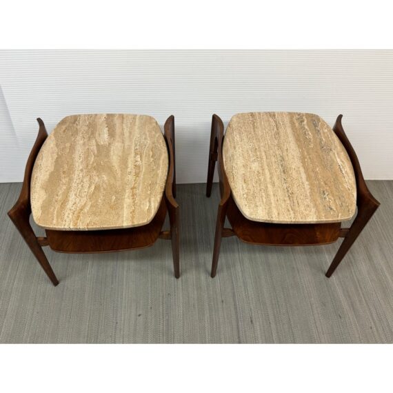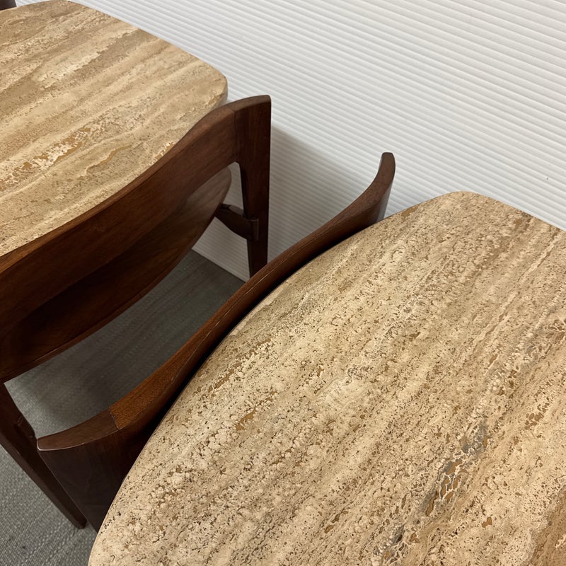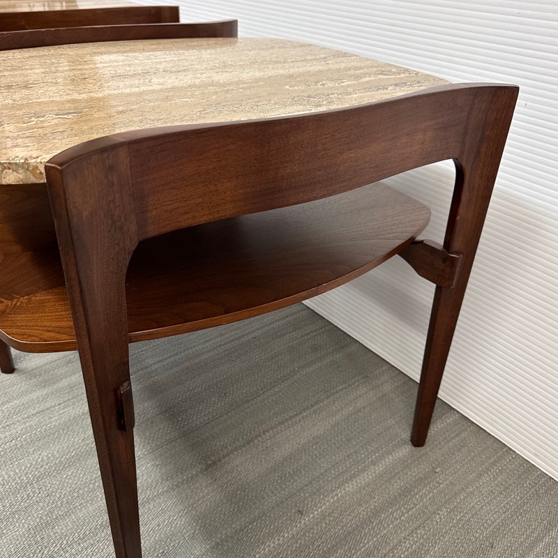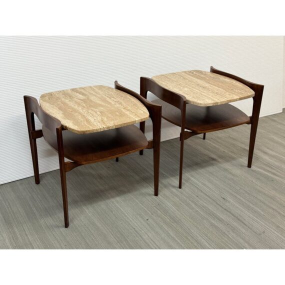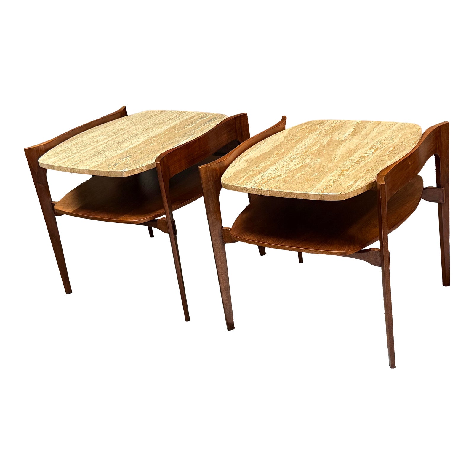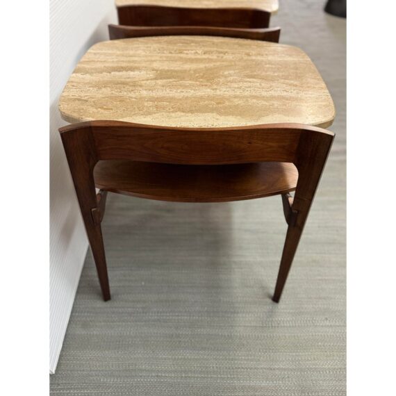 Design Plus Gallery represents walnut + travertine end tables by Bertha Schaefer.