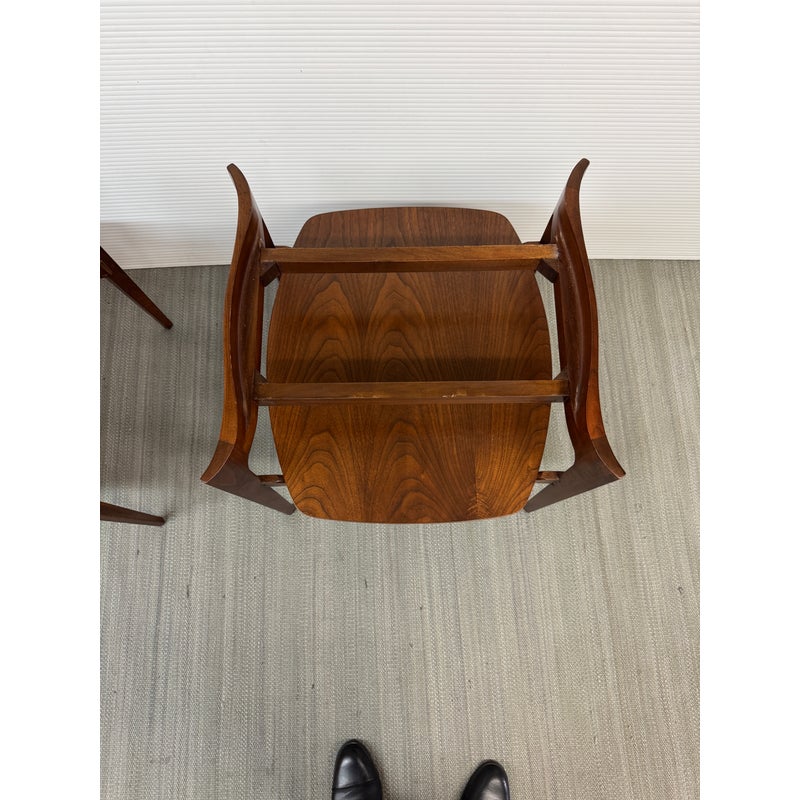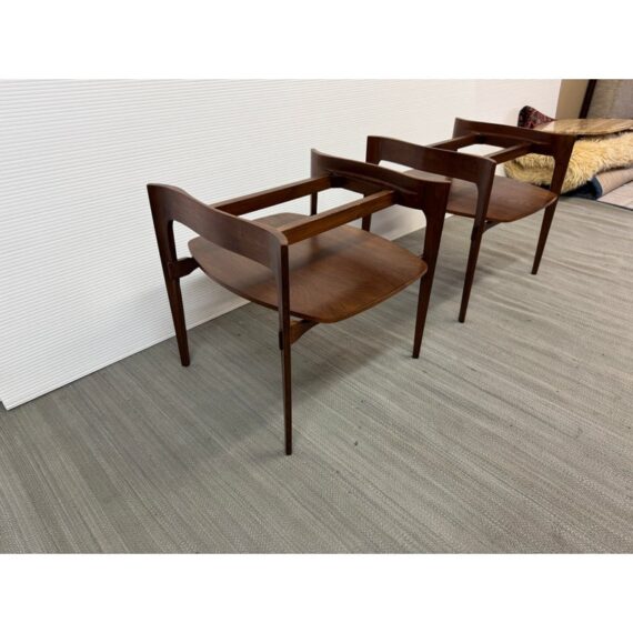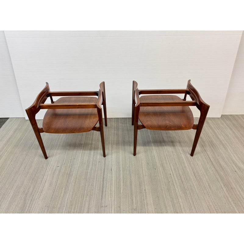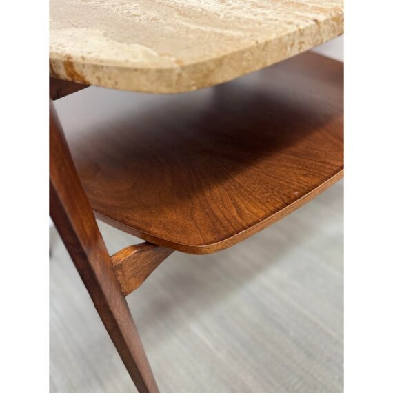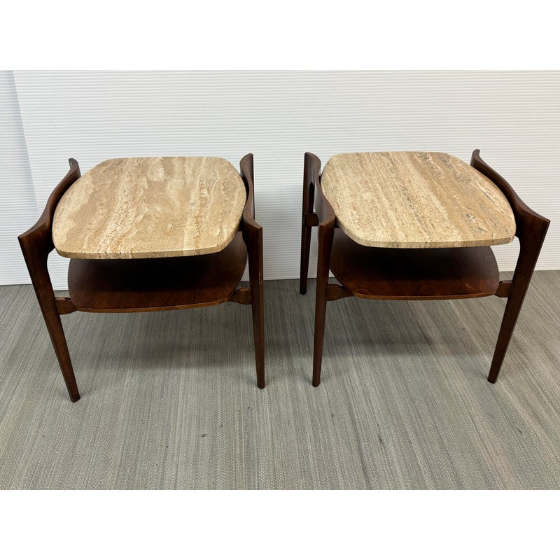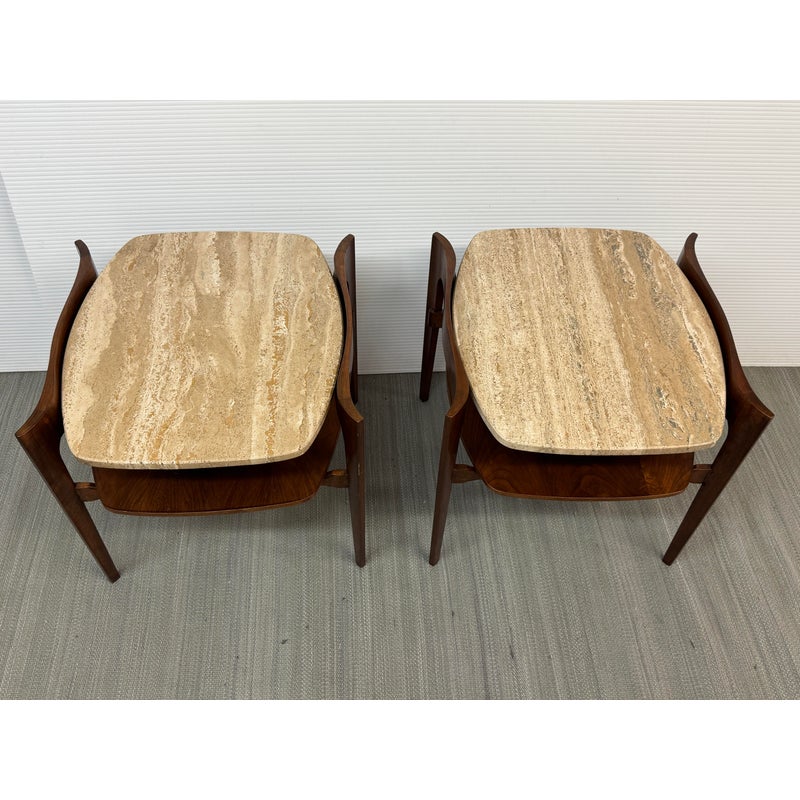 Design Plus Gallery represents walnut + travertine end tables by Bertha Schaefer.