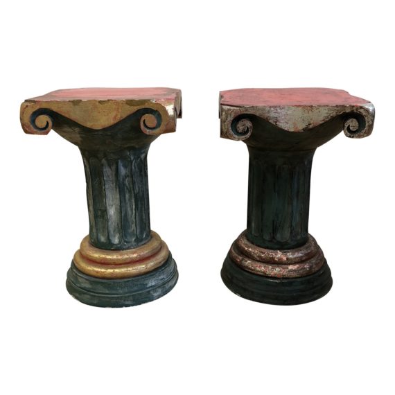 Design Plus Gallery presents a pair of vintage wood column pedestals. Both pedestals are in the same design, yet with different finishes. One is a darker green finish with silver leaf and red underneath, while the other is a lighter green finish with gold leaf and red underneath. Showcase them together or separately. Natural distressed wear on finish and structure.