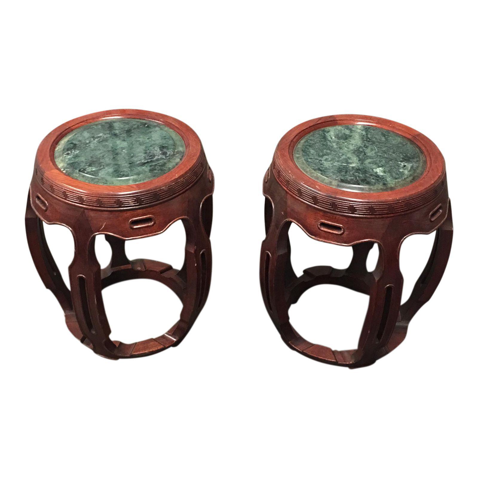 Pair of Vintage Chinese Rosewood + Jade Round Side Tables / Stools