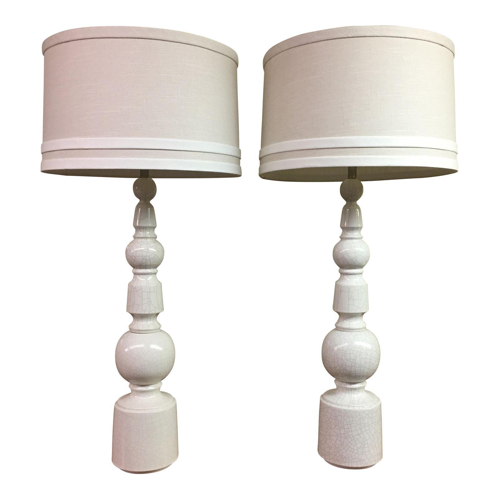 Design Plus Gallery has a pair of White crackle finish table lamps. These beautiful lamps are brought to life with custom made white double banded lamp shades. These lamps are sure to brighten any Decor. They have a lovely presence!