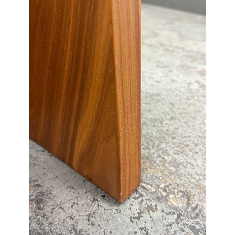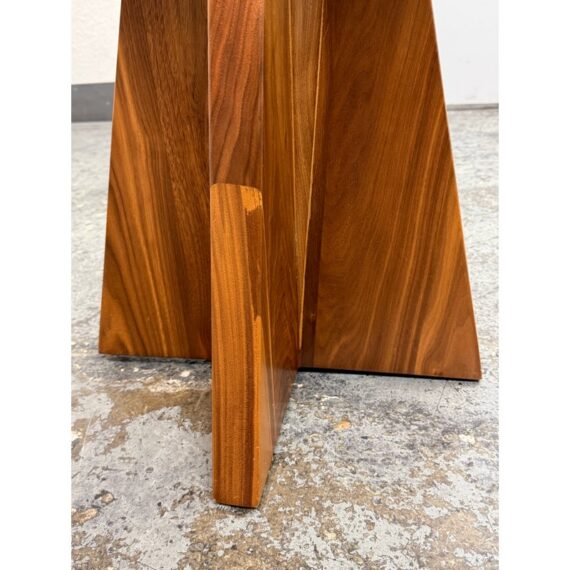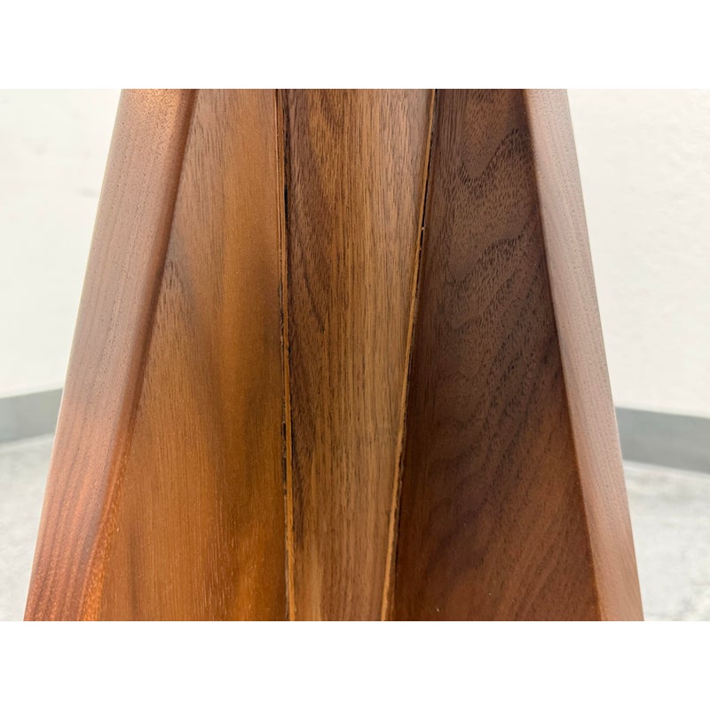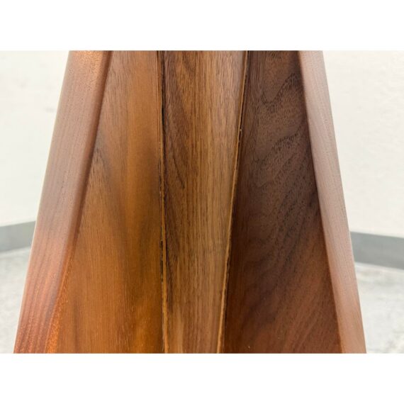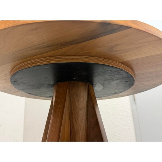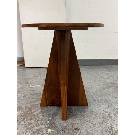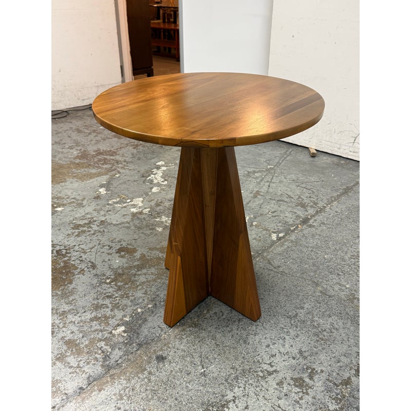 Design Plus Gallery presents a Frisco Accent Table from PAIR’D Furnishings. This round wood table has a softly beveled top and a sculptural pedestal base formed by four intersecting tapered panels. The visible grain variation and angular silhouette give the piece a tailored, architectural presence, while the compact scale and balanced proportions reflect a contemporary profile. It is in good condition with visible and minimal wear from usage.