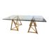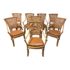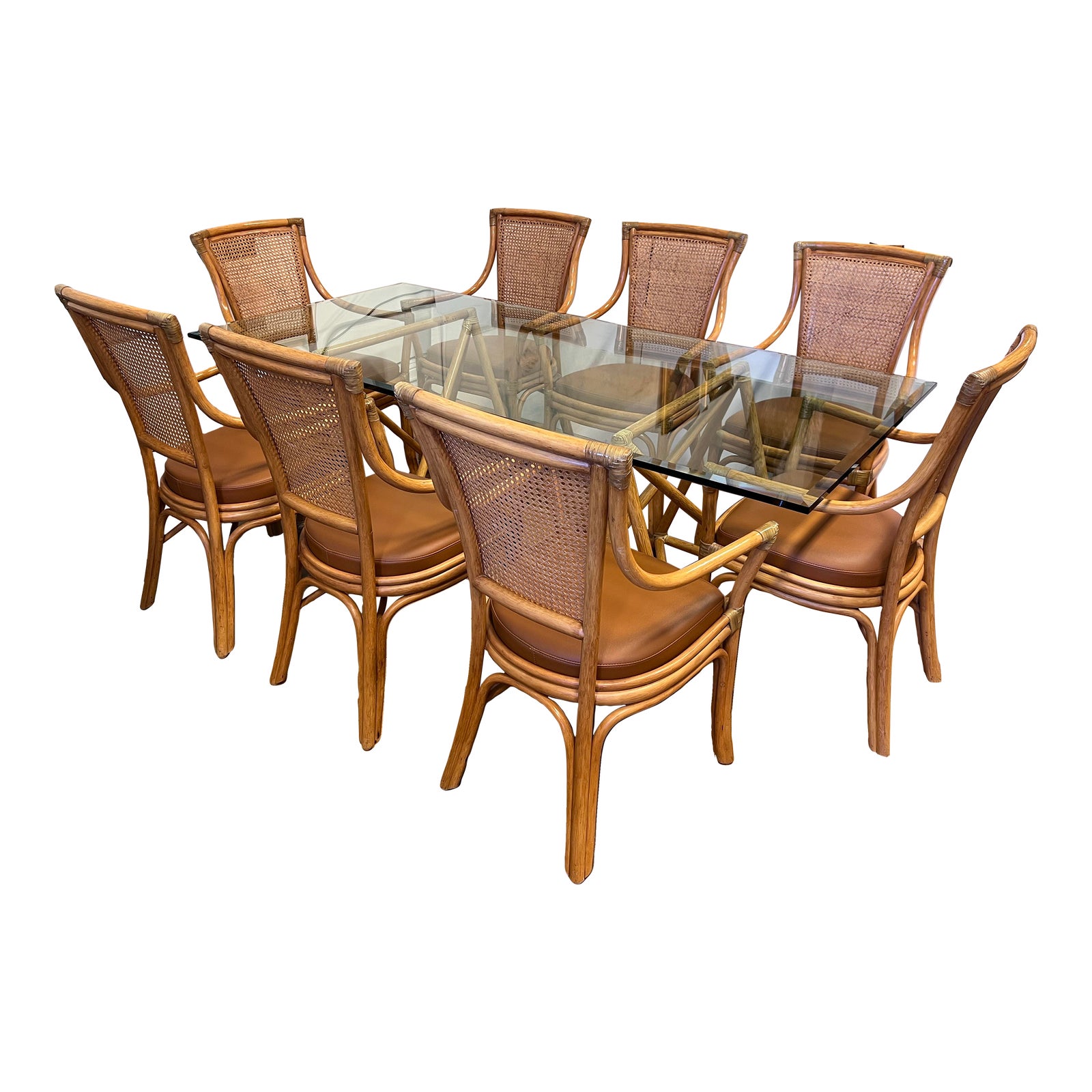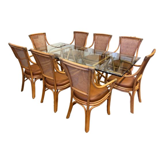 Design Plus Gallery presents a Bamboo, Cane + Glass Dining Room Table + Eight Arm Chairs from Palecek. This postmodern organic bamboo + leather table resembles the iconic style of McGuire. Executed to perfection with a beveled edge glass table top. The set of eight arm chairs are a luxury addition to the table, perfectly balanced to flow smoothly with your beachy/boho decor. The seats are a Sienna leather, caned seat back with a bamboo frame. The set as a whole is in good condition for its age + use.