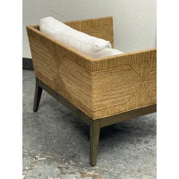 Design Plus Gallery presents a Cameron Lounge Chair and Half from Palecek. Combines striking craftsmanship with inviting comfort, making it a luxurious statement piece for any living space. The base frame features an understated yet elegant dark espresso finish, enhancing its rich, contemporary appeal. Showcasing Palecek’s mastery of natural textures, the chair’s double-wall back and sides are handwoven from natural seagrass rope, resulting in an eye-catching pattern that adds dimension and visual interest from every angle. A fixed seat cushion for stability and support, while a loose back cushion and a coordinating bolster pillow invite you to relax in style. The blend of natural materials with tailored upholstery creates a harmonious balance of organic warmth and sophisticated design. In good condition, visible and minimal wear on frame and upholstery. This is a discontinued model from the brand.