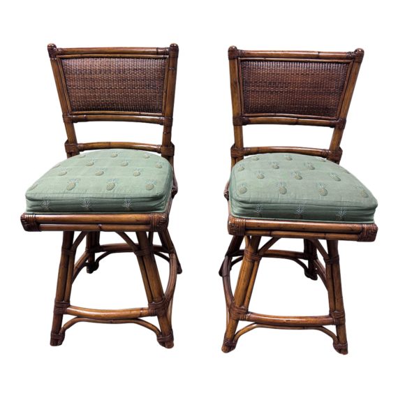 Design Plus Gallery presents a Pair of Palecek Counter Stools. The pair have an island influence to their design, a carefree look and style to add into your kitchen, bar area. The wood has the look of bamboo with cane to the back. The seat cushion fabric is a print in sage green with pineapples. The pair are in good shape with visible and minimal wear from usage + age. Visible chipping on finish nature distress.