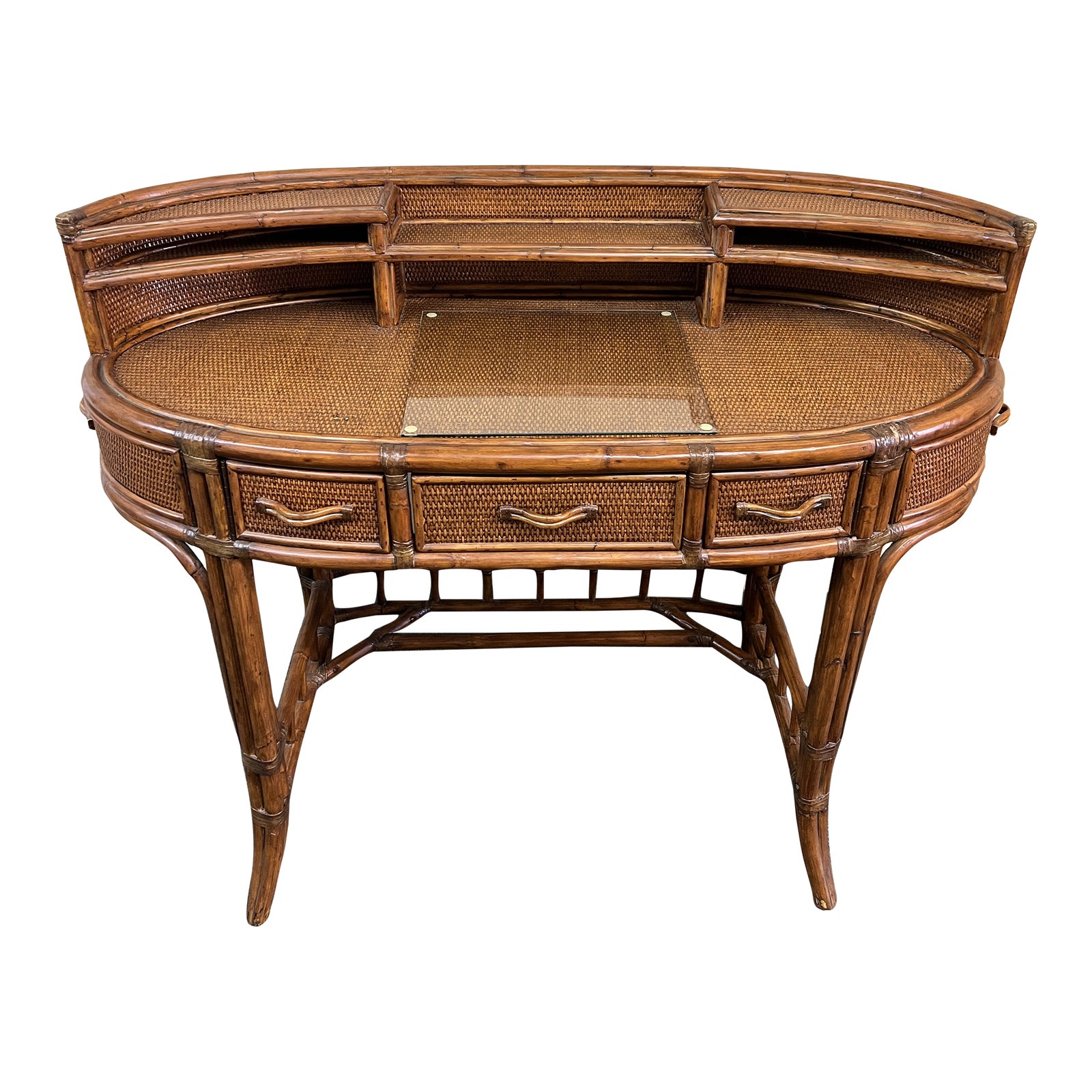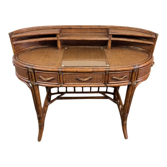 Design Plus Gallery presents The China Bay Writing Desk by Palecek. Lovely tight-woven rattan creates the organic surface that is framed by curving, elegant bamboo. Five shallow drawers spread like wings to hold accoutrements, organizer cubbies line the back. Small glass liner included for writing surface. Lovely scale that fits in many areas of the home.