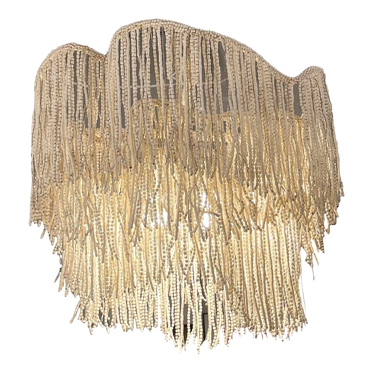 Design Plus Gallery presents an Elena Coastal Beach Cream Wood Beads Chandelier from Palecek. Strands of tiny wood beads in a cream finish embellished with glass beads hand-painted in silver attached to a powder coated white metal frame. In good showroom sample like condition.