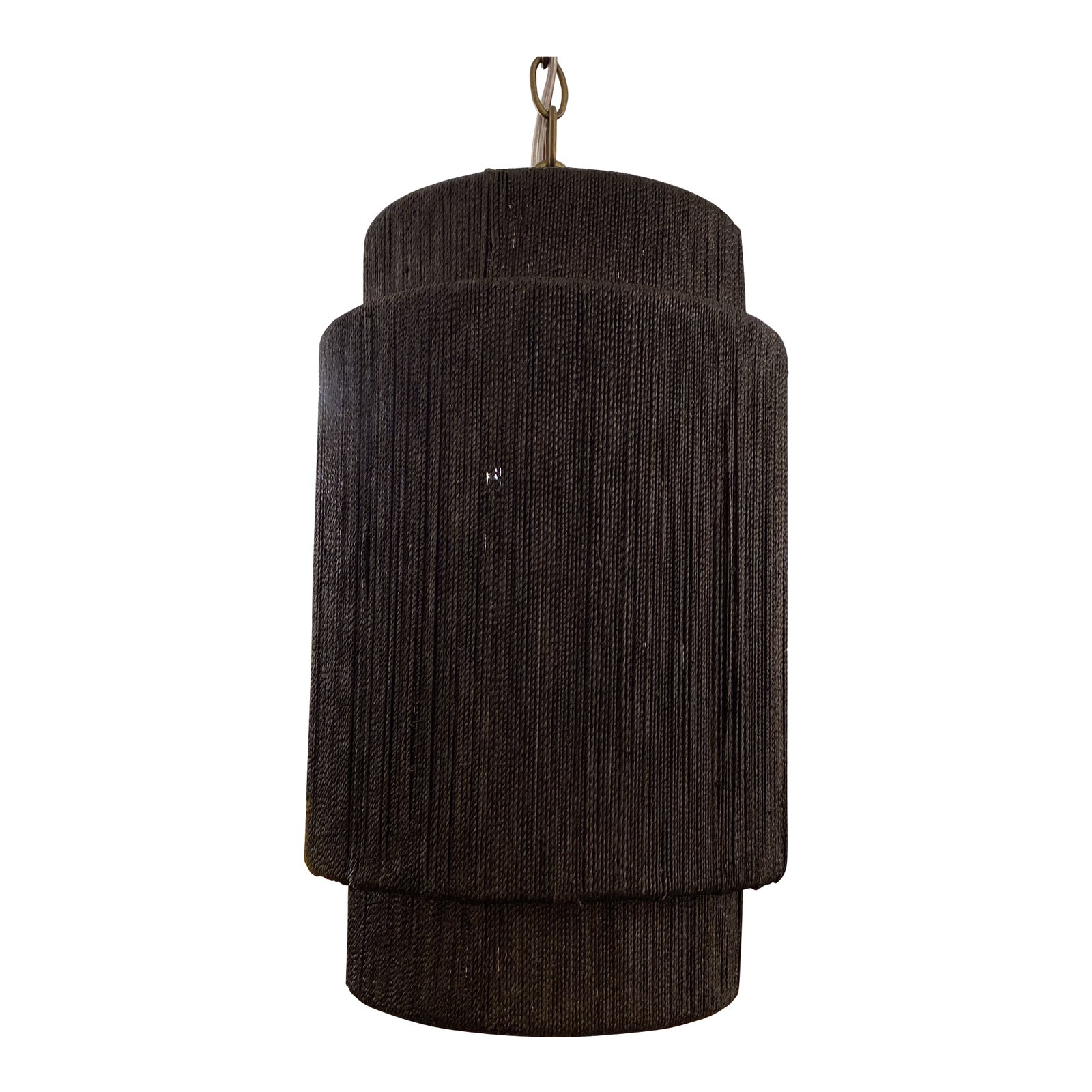 Design Plus Gallery presents the Everly Slim Pendant from Palecek. This slim pendant has a natural fine strand Abaca Rope wrapped around the frame. The pendant allows gentle light to peek through, creating a warm and inviting atmosphere. This pendant has an sspresso shade with Antique Brass chain + canopy. In good showroom sample condition.
