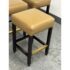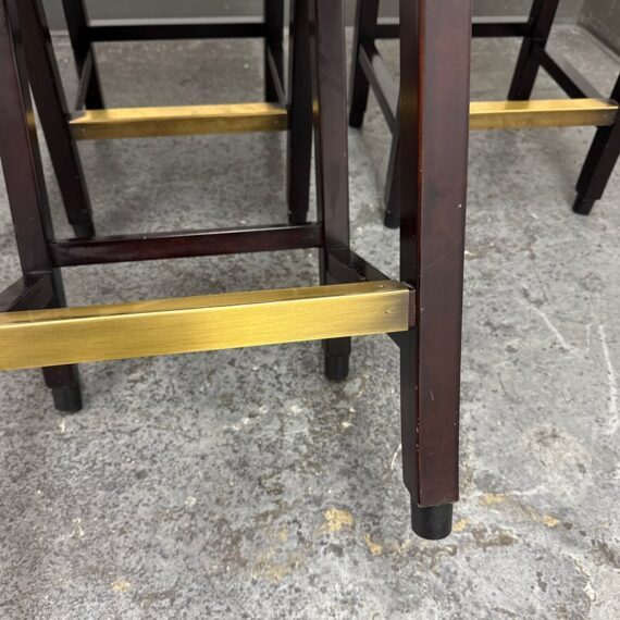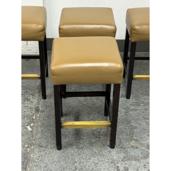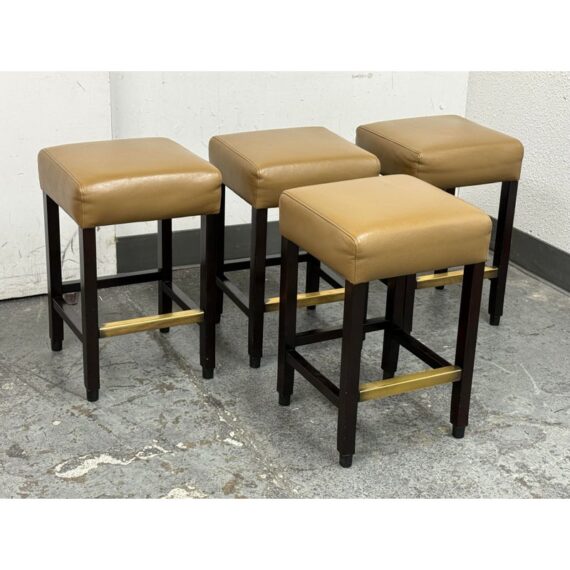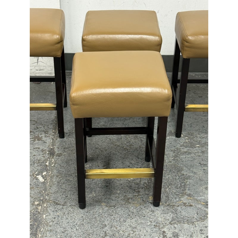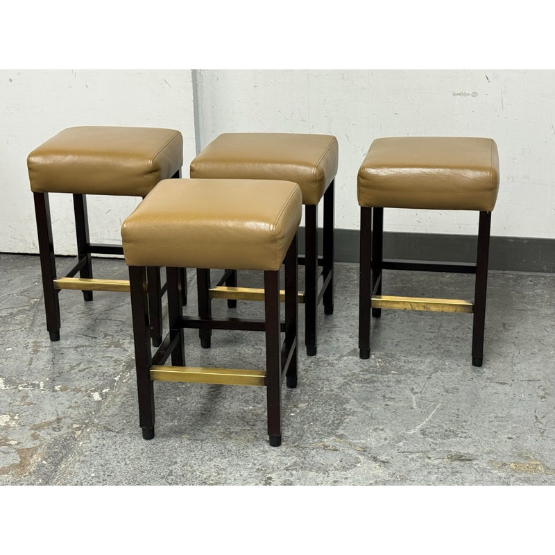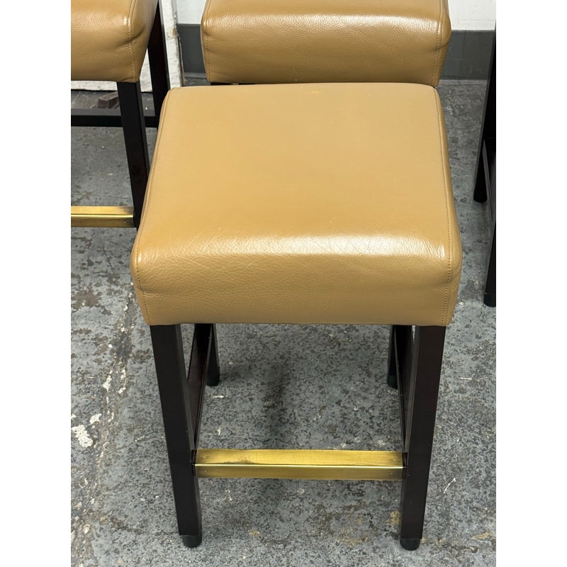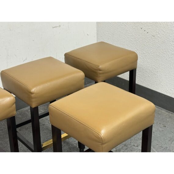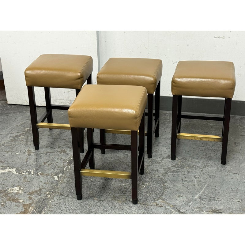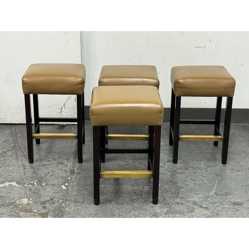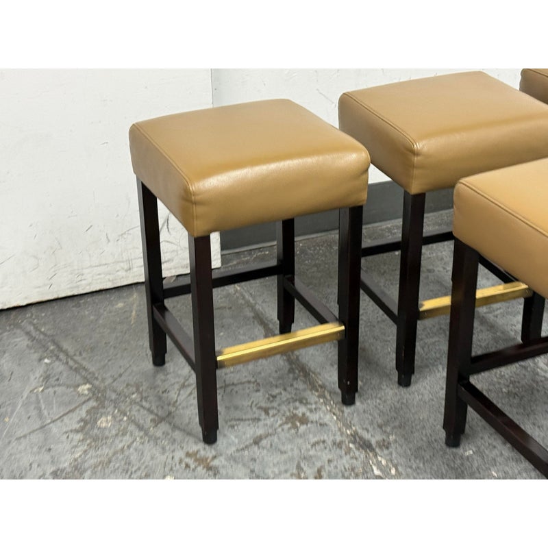 Design Plus Gallery presents a Set of Four Hudson Backless Stools from Palecek. Each stool stands on elegant, solid wood legs finished in a deep ebony stain, providing a striking contrast to the luxurious upholstery. The legs are accented with a brass footrest, are upholstered in Holly Hunt leather, and seamlessly marry comfort and style—making them an elevated addition to any kitchen island or counter-height dining space. Upholstered by Kroll Furniture of San Francisco. In good condition, visible wear on frames and minimal wear on leather. The stools style have been discontinued by the brand.