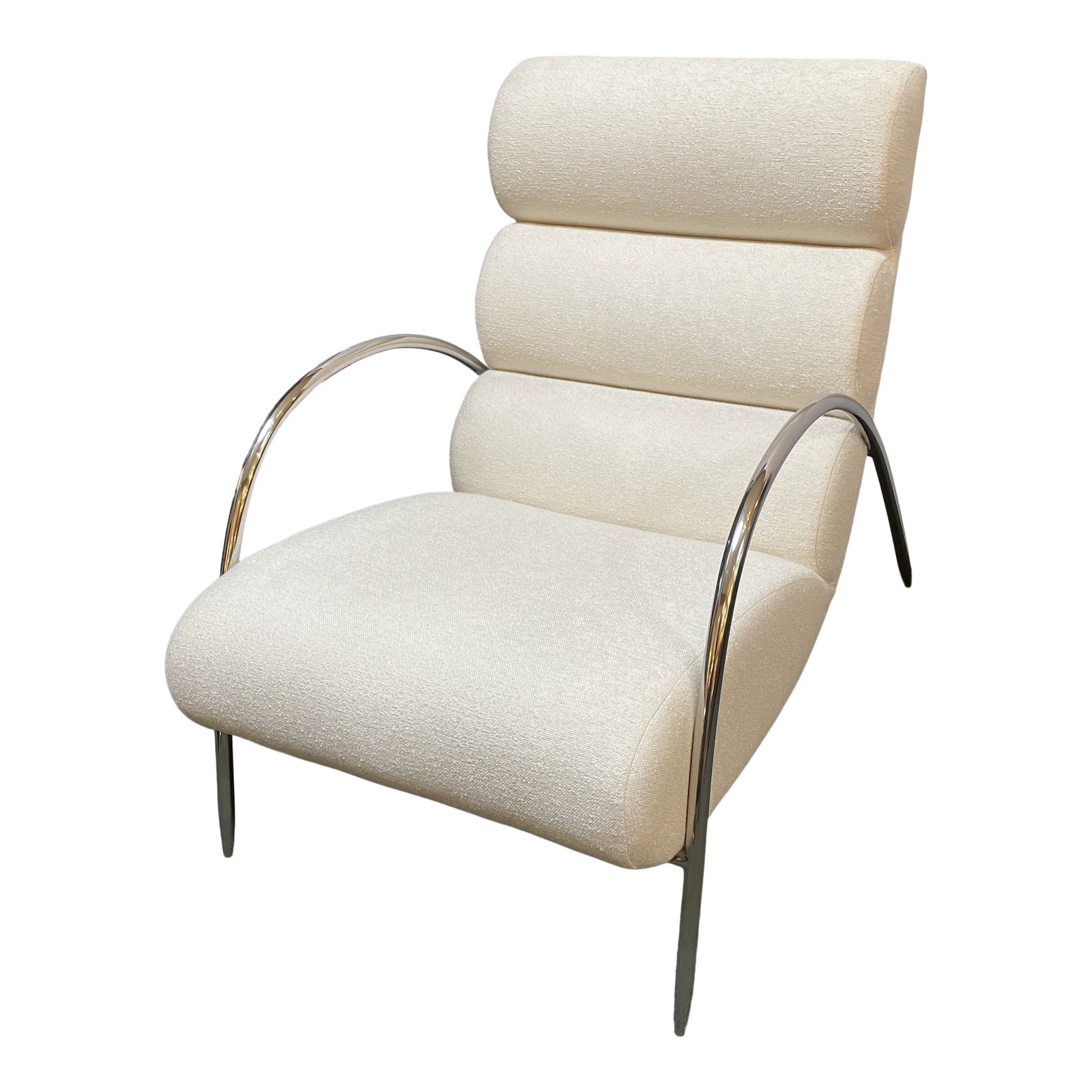 Design Plus Gallery presents a Palecek Santiago accent chair. The frames were rendered in tubular Stainless Steel which has a polished Chrome finish. The seat and backs are upholstered in an Off-White Boucle fabric. The pair has a Classic Modern sensibility.
