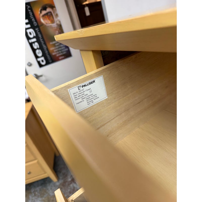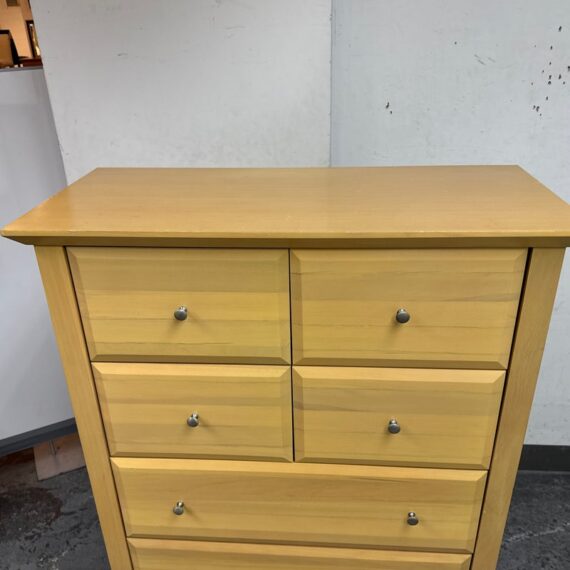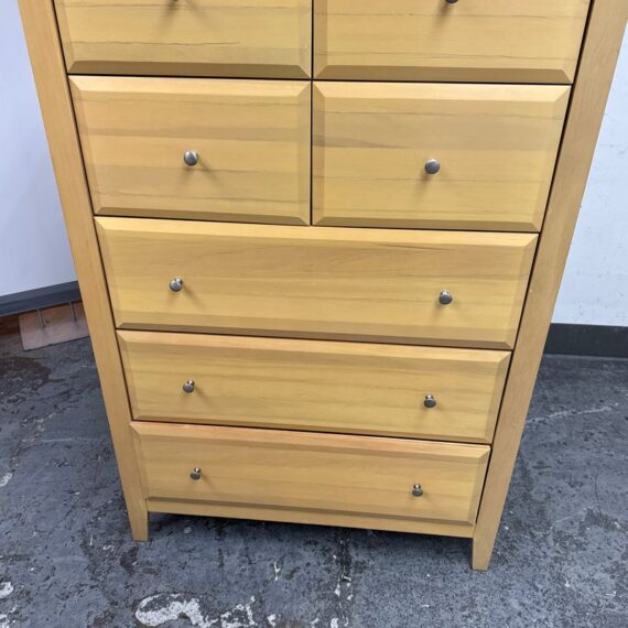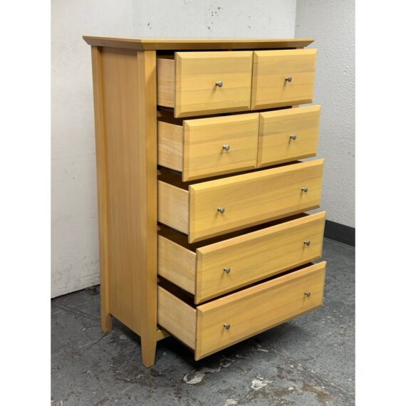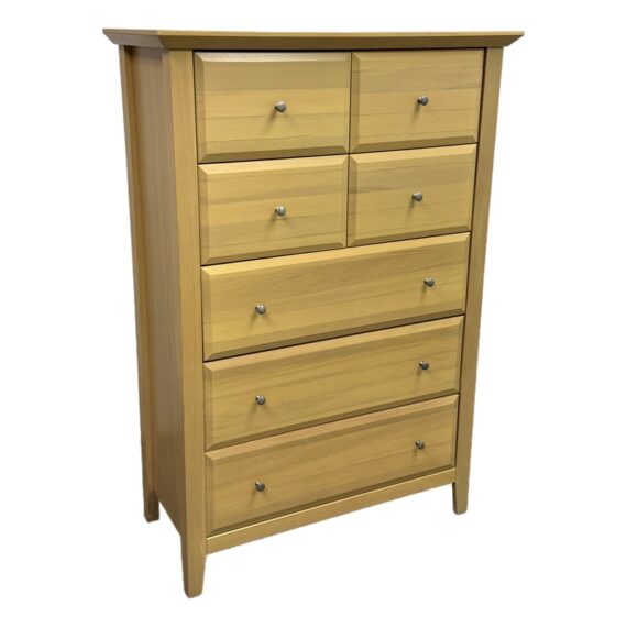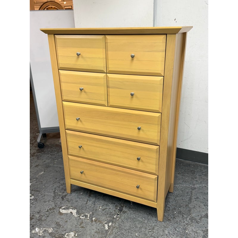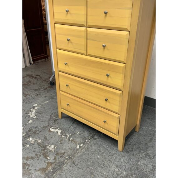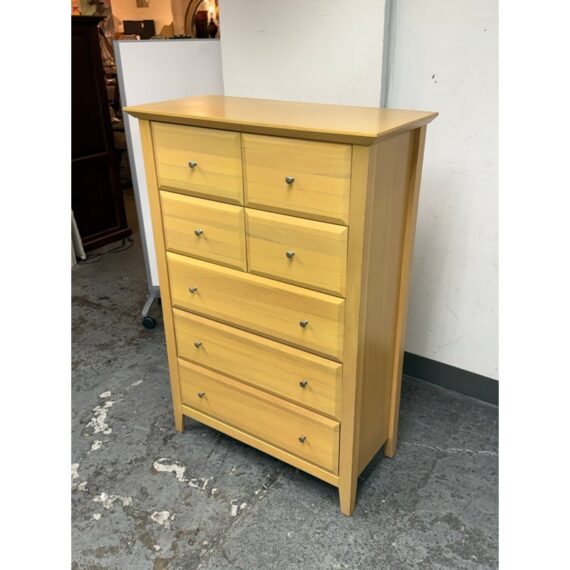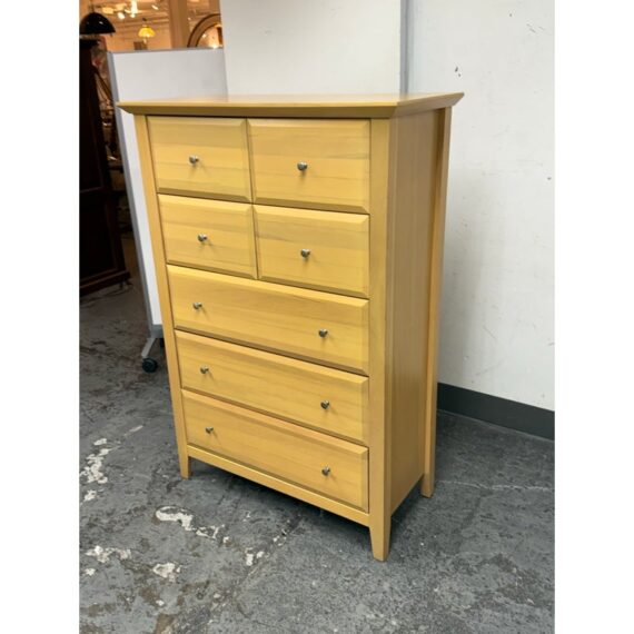 Design Plus Gallery presents a Maple Wood Finished Chest of Drawers from Palliser. The tall dresser offers four half width drawers in the top two rows with three full width below to provide you with perfect storing of your garments. The entire piece is finished in a natural maple wood for a warm glow and is supported on four tapered legs. The design is transitional and will work in many styles for your home. In good condition, visible and minimal wear from usage. Made in Canada.