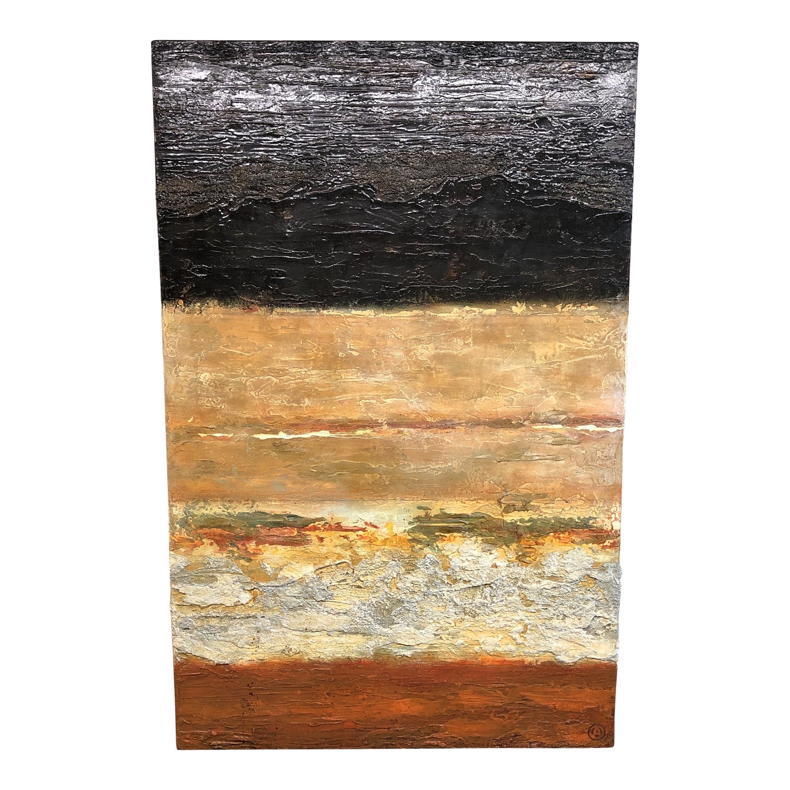 Design Plus Gallery presents a mixed media original by Angela De Oliveira. Large scaled and dramatic, the piece is layered and troweled thickly creating a scene of one’s own imagining.