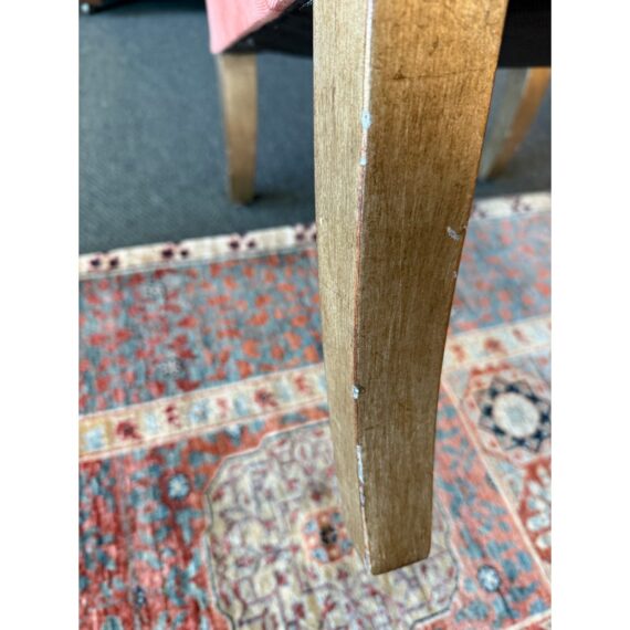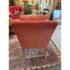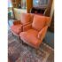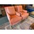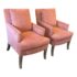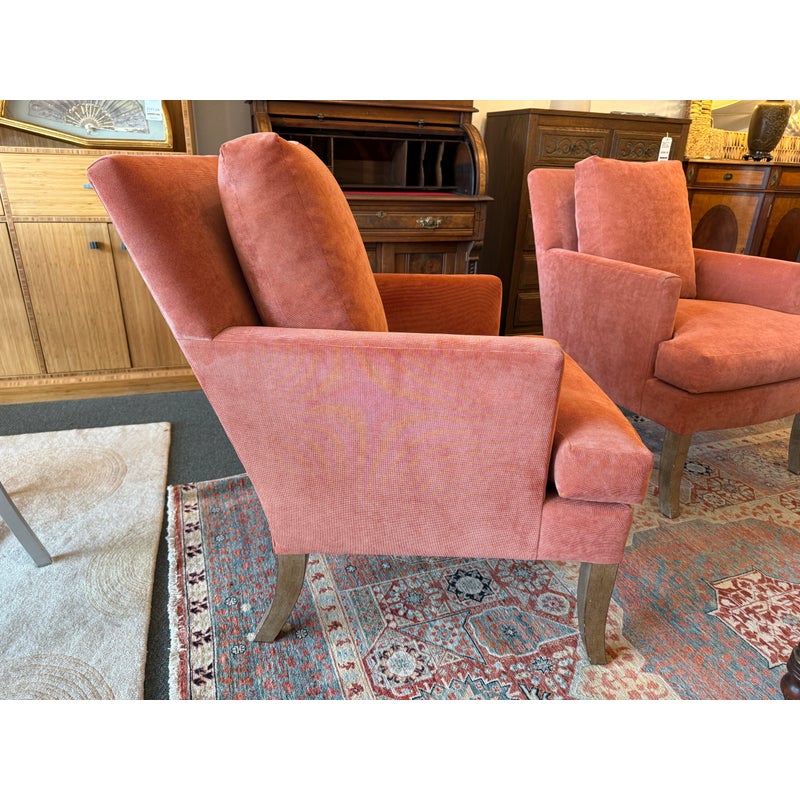 Design Plus Gallery presents a Pair of Rose Pink Lounge Chairs by Patricia Edwards, Nob Hill. The chairs offer you a traditional seat with streamlined arms and leg for a more tailored, modern contemporary silhouette. The brand is known as a premium upholstery store and designer of well crafted furnishings, with these two chairs be no different. The have removable seat and back cushions that match the same tone as the all over fabric of a rose pink, or salmon tone. They were custom tailored and ordered, and are no longer in production with the brand. They show signs of distress and wear to the fabric and nicks to the wood, overall they are considered to be in fair condition for their age. Made in the USA.