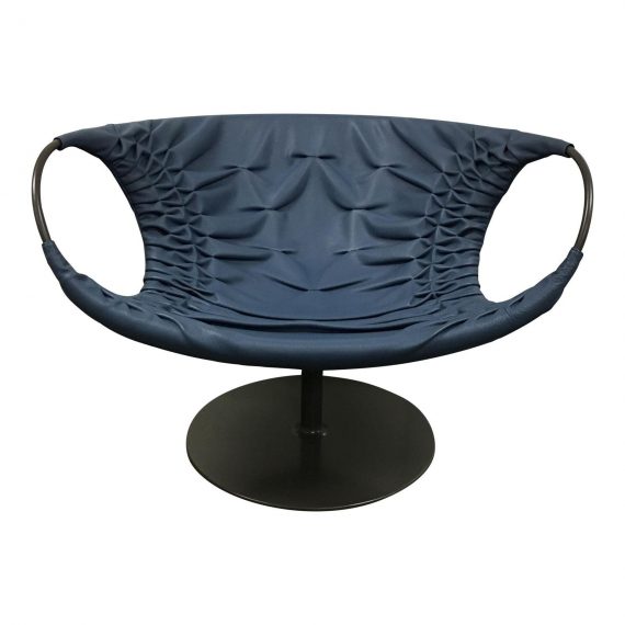 Design Plus Gallery presents a Moroso “Smock” swivel chair. This chair was designed by Patricia Urquiola for Moroso. The chairs frame which includes the round base plate has been rendered in metal which has been powder coated in a deep Gray color. The seat and back are comprised of one piece of Grayish Blue leather which is wrapped around the frame and secured. The chair is further enhanced by actually smocking the the leather. Smocking was popular in days gone by , especially on little girls clothing. It merely means to gather and stitch fabric together to create a pattern. This is a conversation piece for sure!